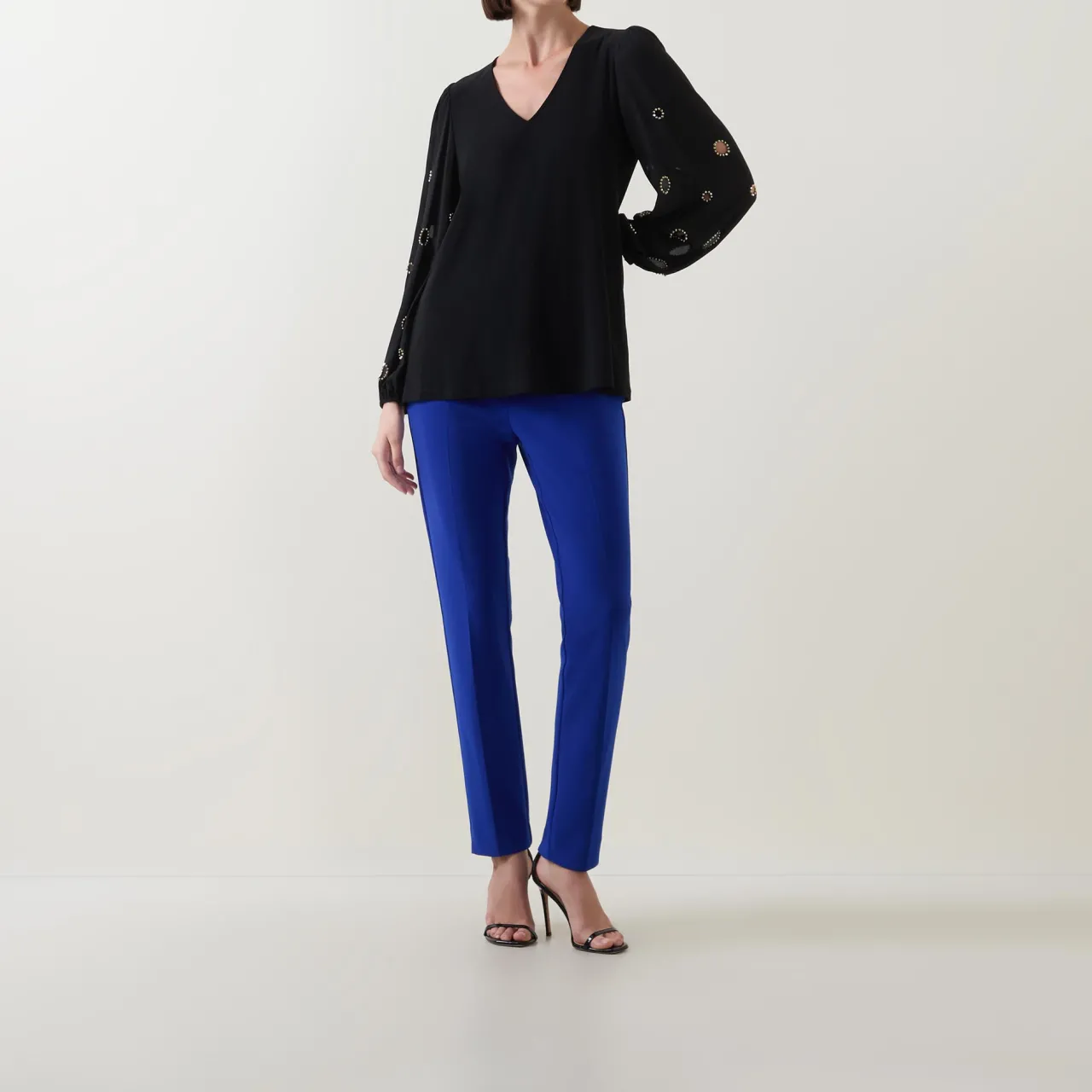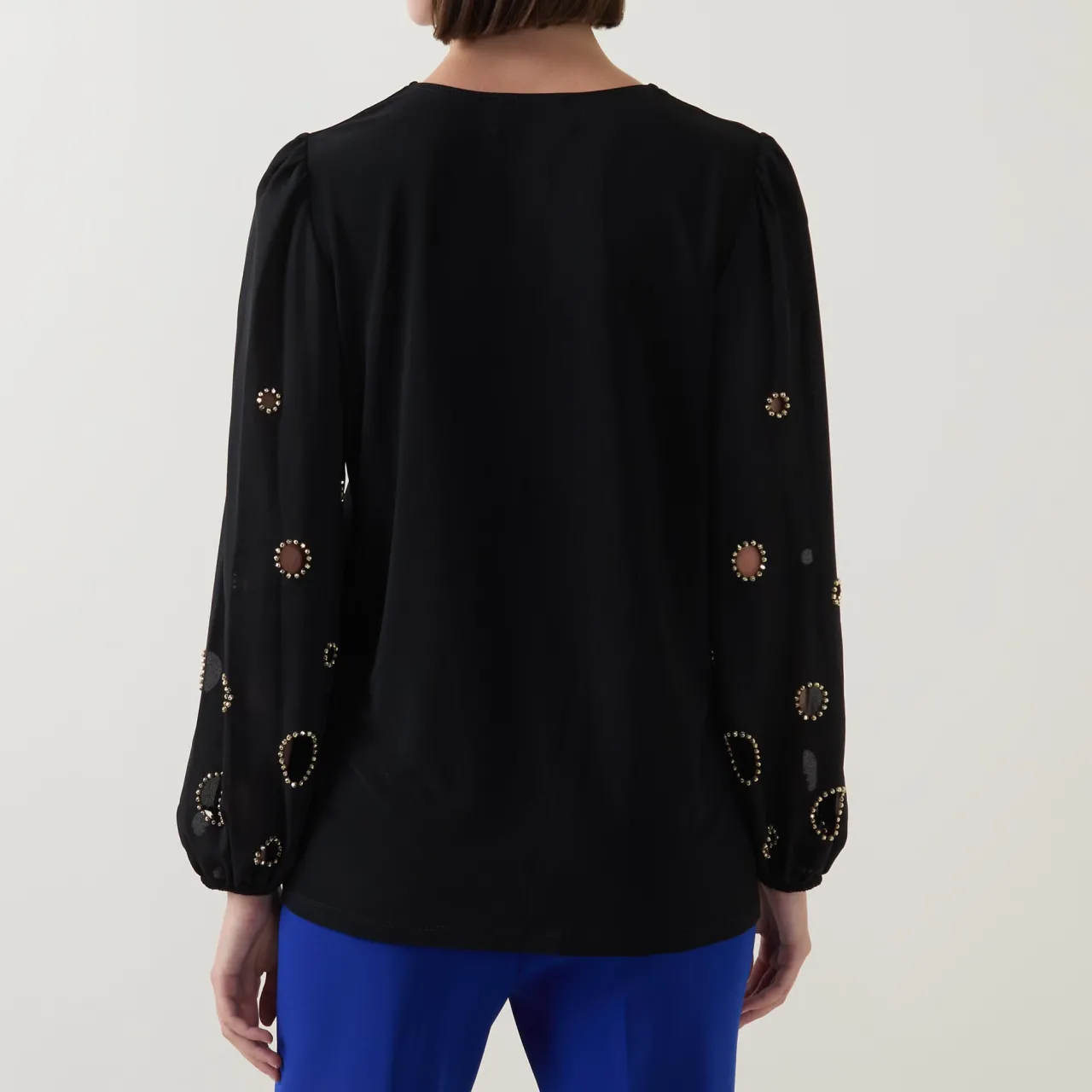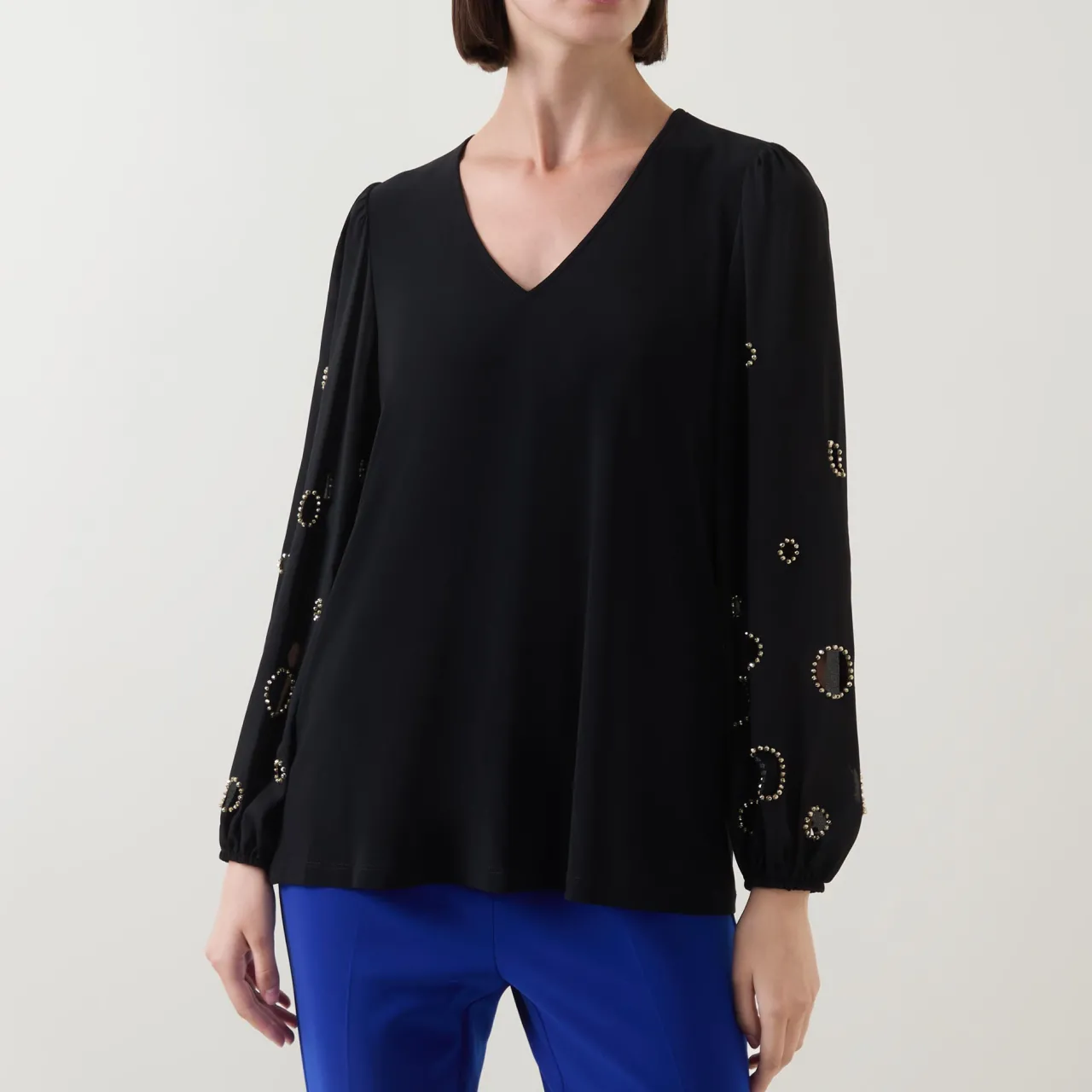 - V-neckline, straight hemline, long sleeves, elasticated cuffs, bead embellishment