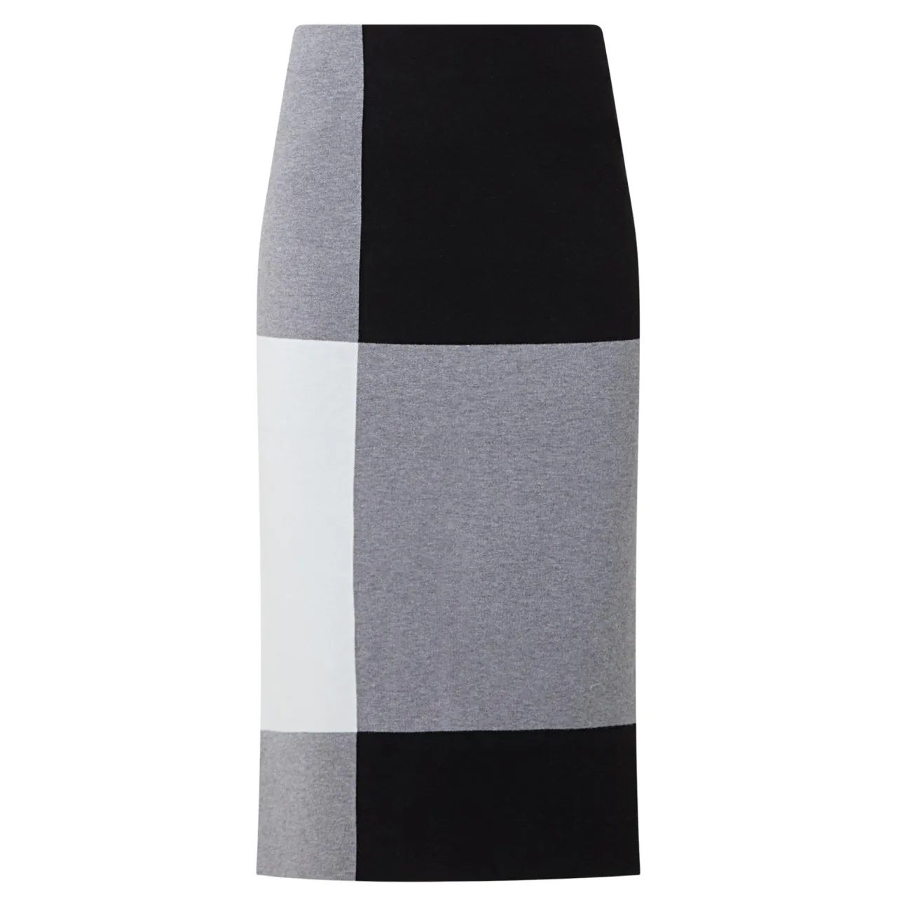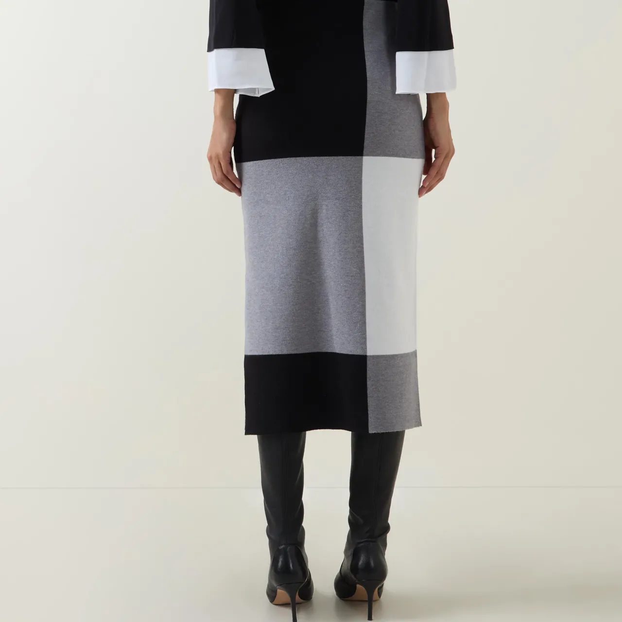 - High-rise, panelled colour-block design, pencil silhouette, open-cut side slit, midi length, smooth fabric