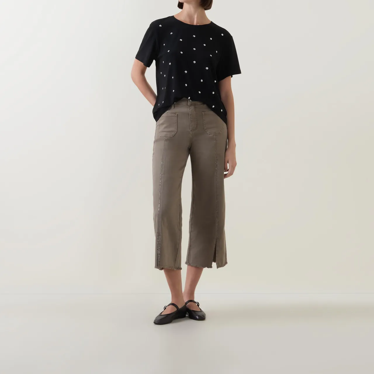- Round neckline, short sleeves, straight hemline, stud embellishment