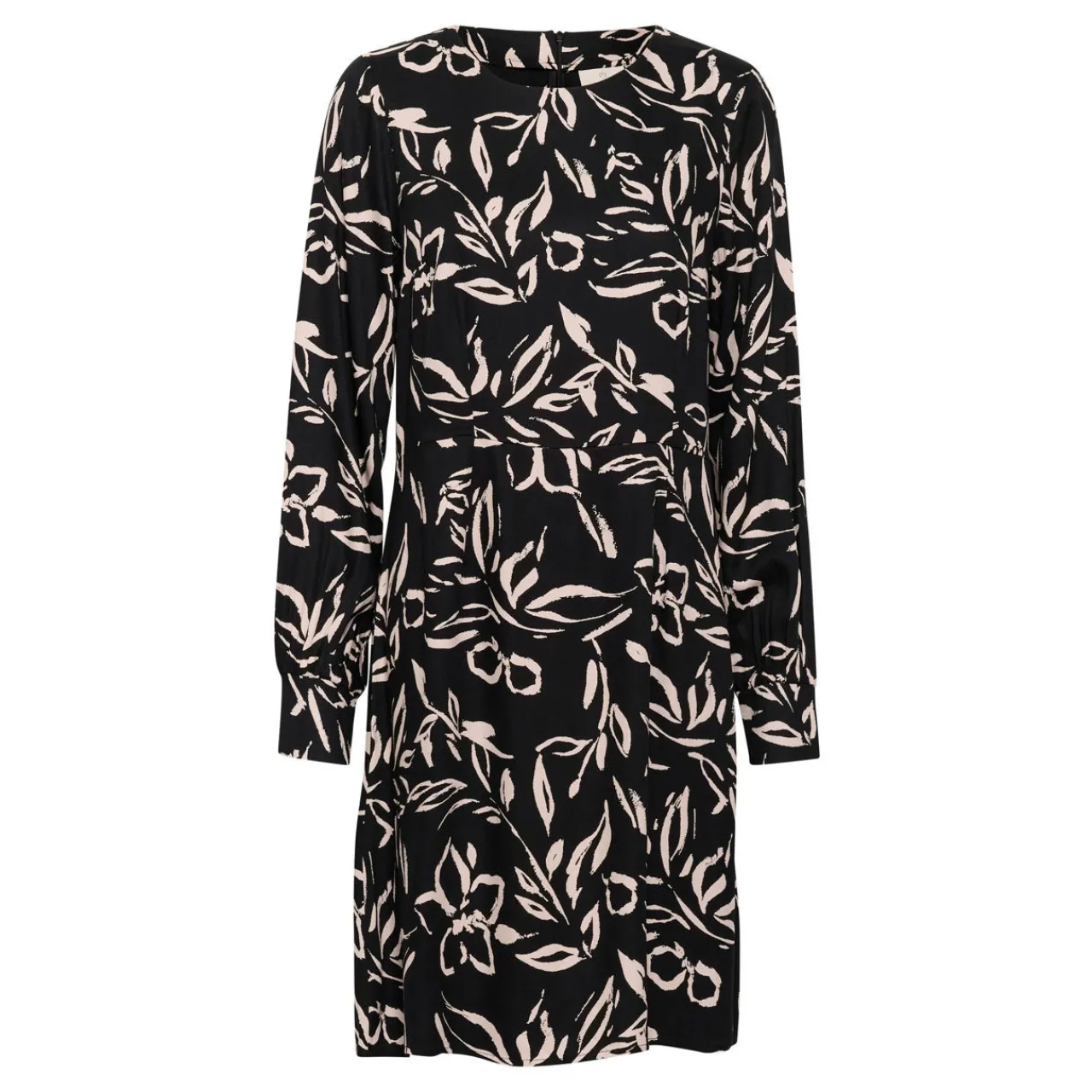 - Round neckline, knee length, blouson-style long sleeves, zip fastening at back, botanical print