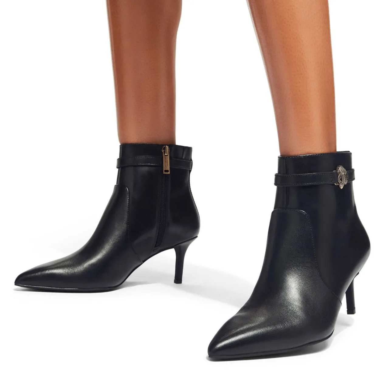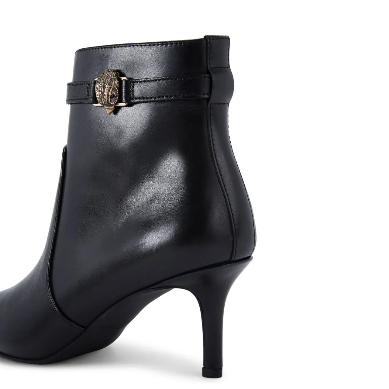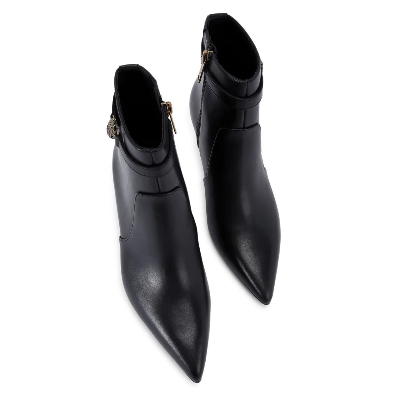 - Ankle height, smooth leather upper, pointed toe, antiqued brass eagle head stud, slim ankle strap, inner side zip fastening, branded zip tab, slim heel
