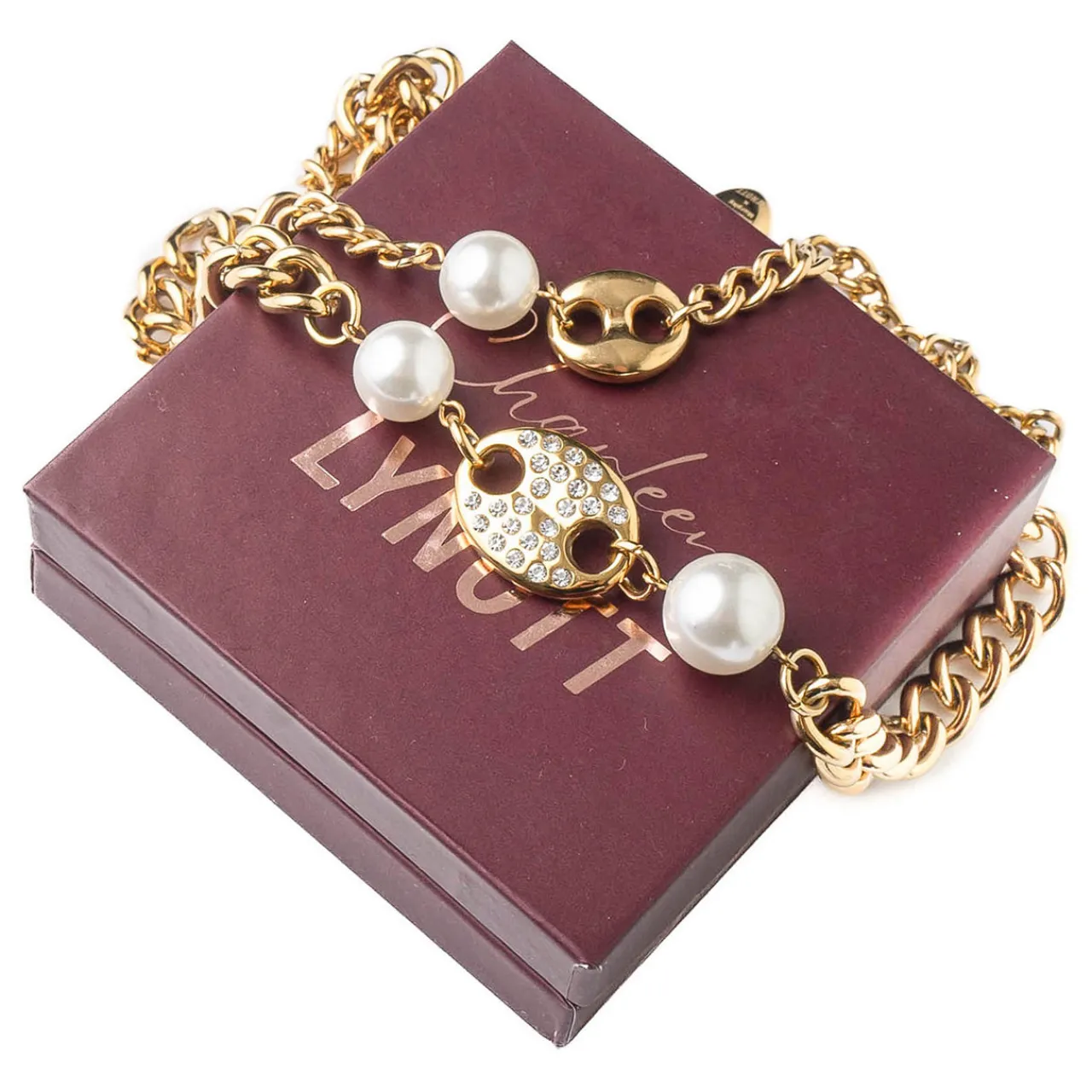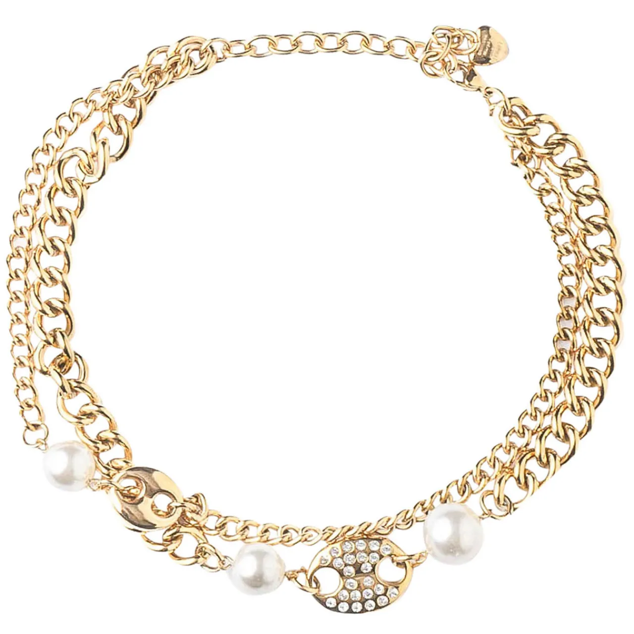 - Double-layered, chunky style, faux pearl and stone embellishments, lobster clasp fastening, heart-shaped logo plate, tarnish resistant and water resistant, adjustable length, gold-plated, presented in a branded gift box