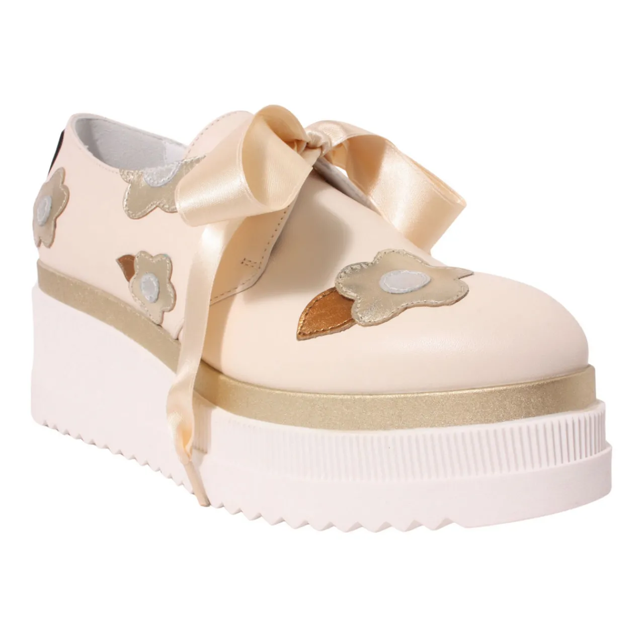 - Lace-up style, high wedge shoe, flower detailing