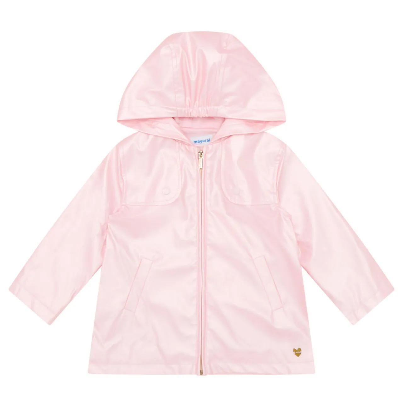- Hood, zip fastening, side entry pockets, heart detail, iridescent waterproof finish