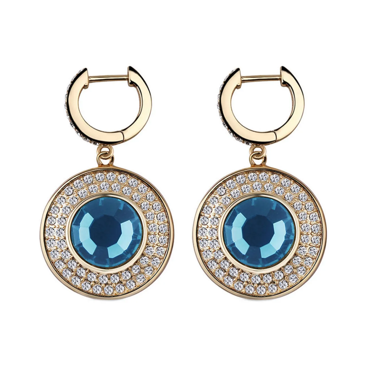 - Montana and clear crystal stone setting, two-tier design, plated posts, gold-toned hardware