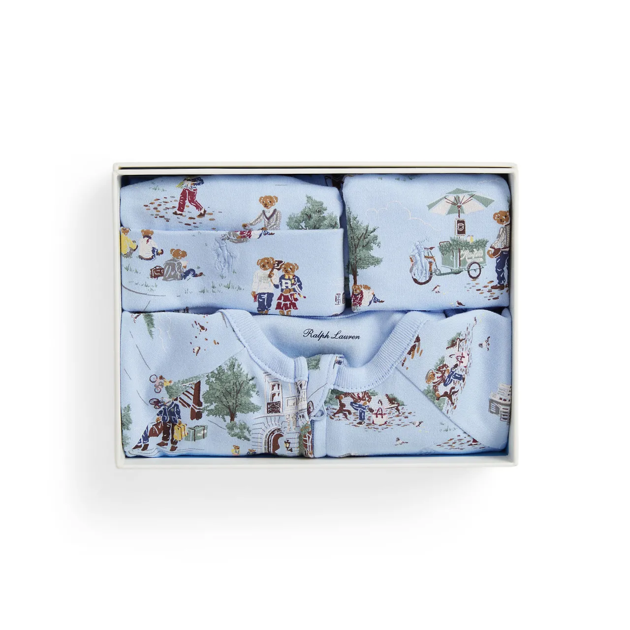 - Hat: Beanie style, Polo Bear motif enjoying sites around New York City’s iconic Madison Avenue, seamed crown, lined. Bib: Snap button fastening, Polo Bear motif enjoying sites around New York City’s iconic Madison Avenue, ribbed trims, lined. Babygrow: Round neck, long sleeves with turnback mittens, zip placket extends to the hem, enclosed feet, Polo Bear motif enjoying sites around New York City’s iconic Madison Avenue
