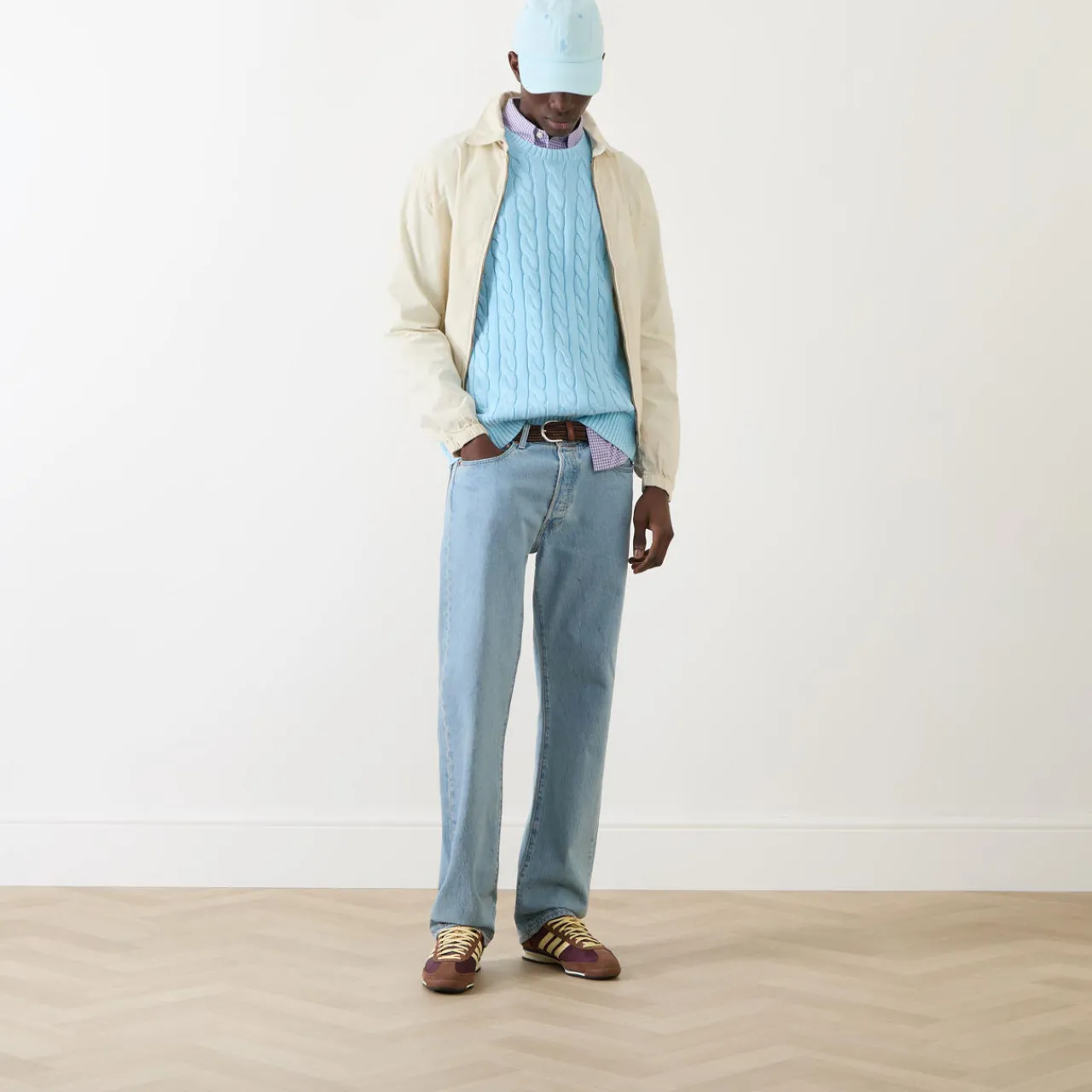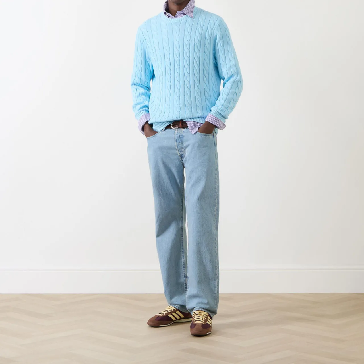 - Polo player logo, crew neckline, long sleeves, cable knit design, ribbed trims