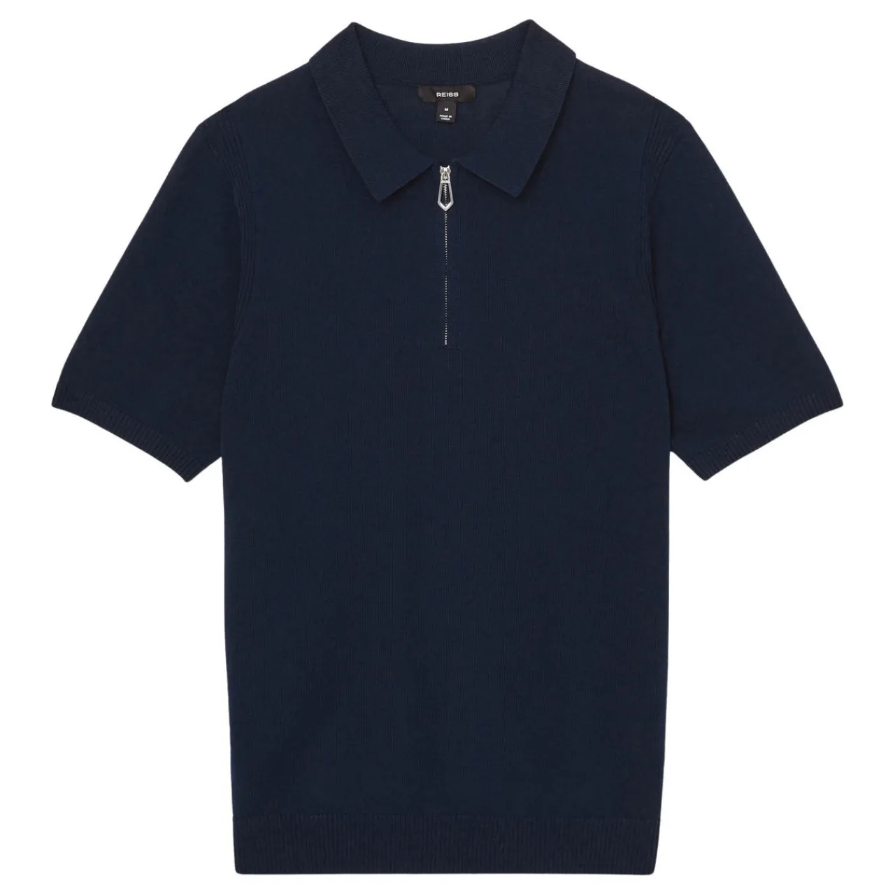 - Fine gauge knit, polo collar, breathable feel, ribbed detailing at the shoulders and sides, half-zip, cut-out metal pull, short sleeves