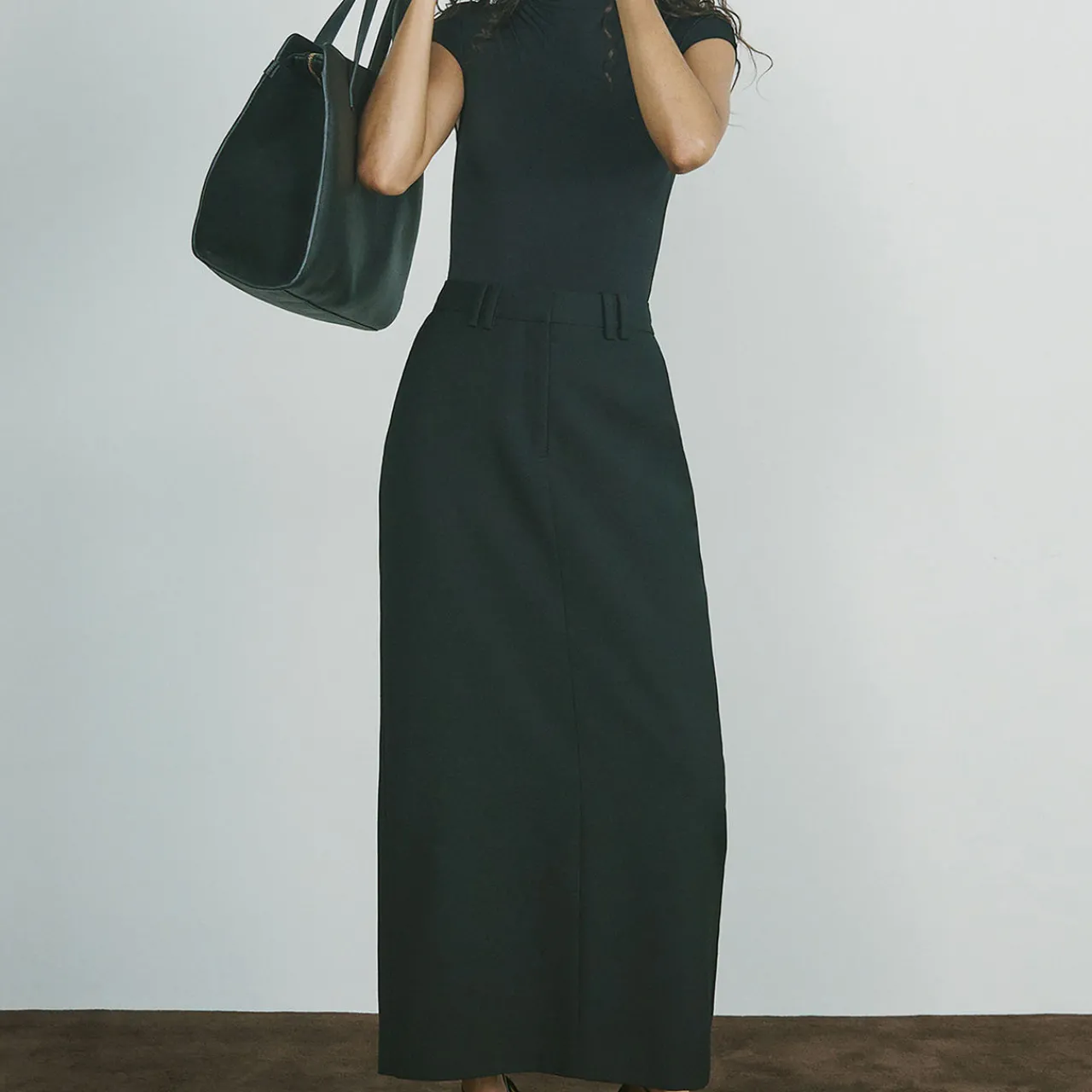 - Textured wool blend, tailored, pencil silhouette, reverse slit, textured finish, side slip pockets, buttoned welt pockets to reverse, lined, hook and bar fastening with zip, maxi length