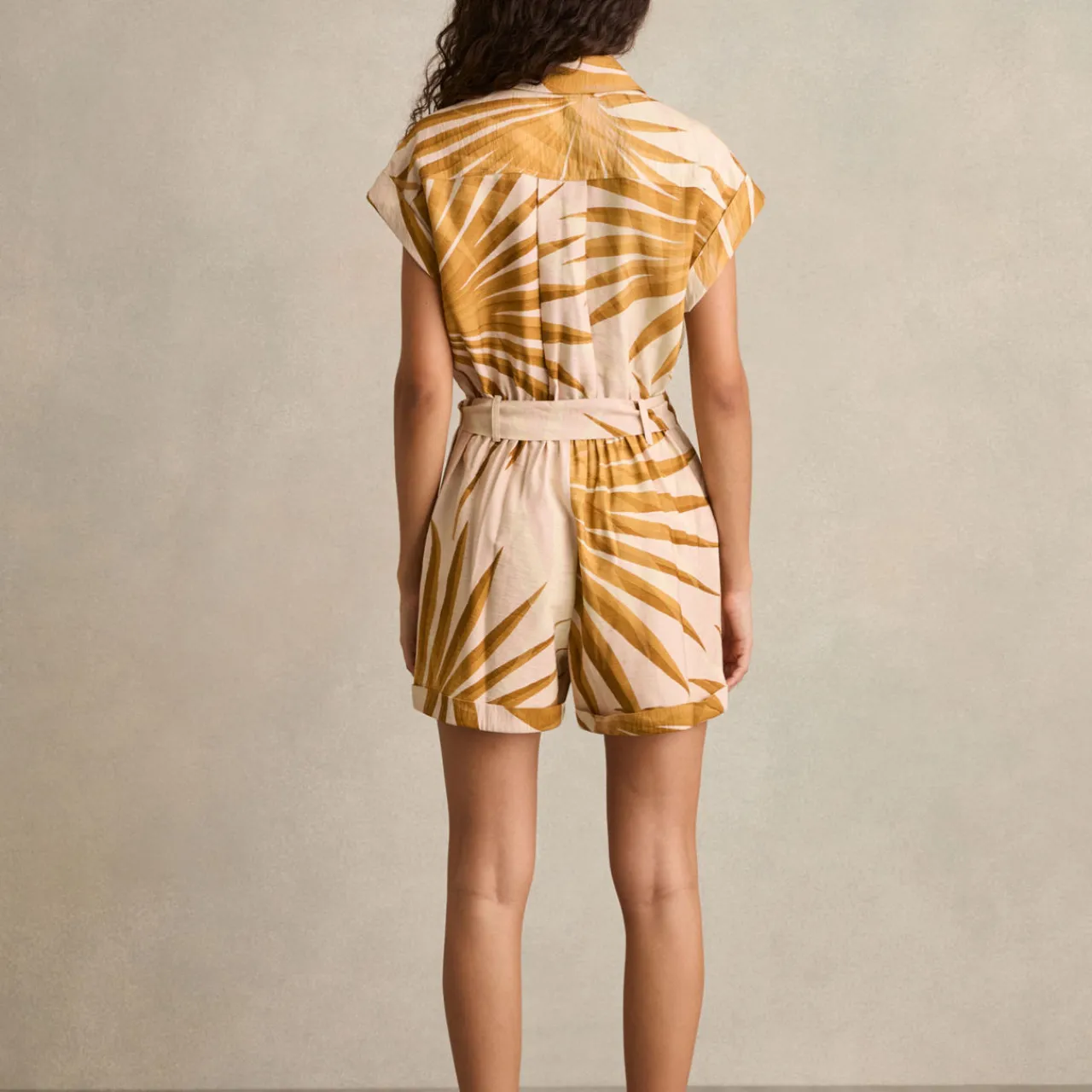 - Palm print, self-tie belt, cuffed cap sleeves, flap patch pockets, side slip pockets, turn-up hems, front button placket, short length, cap sleeve