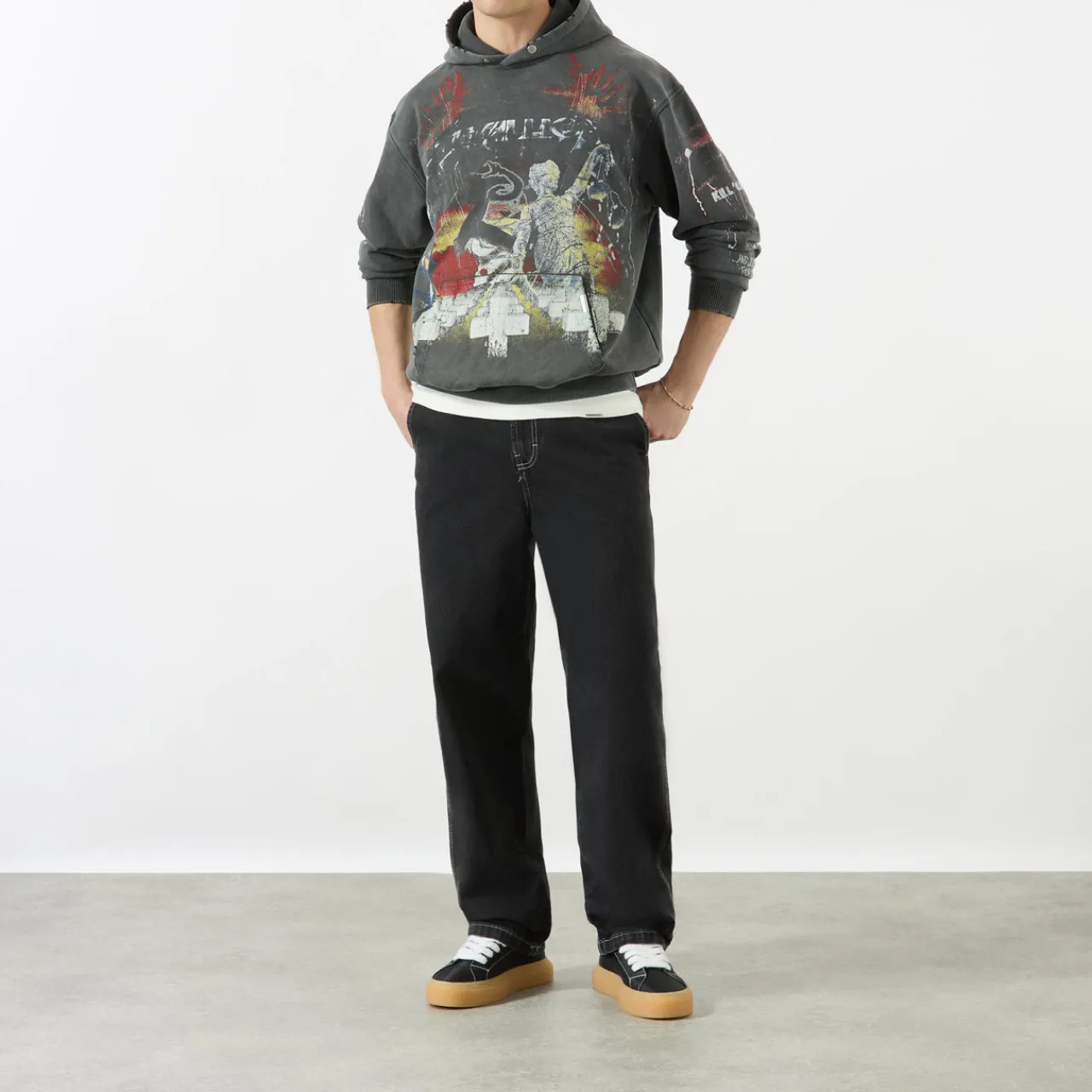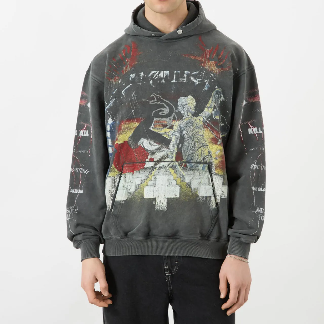 - Long sleeves, oversized fit, popper-fastened hood, Metallica graphic artwork, distressed detail, ribbed cuffs and hem