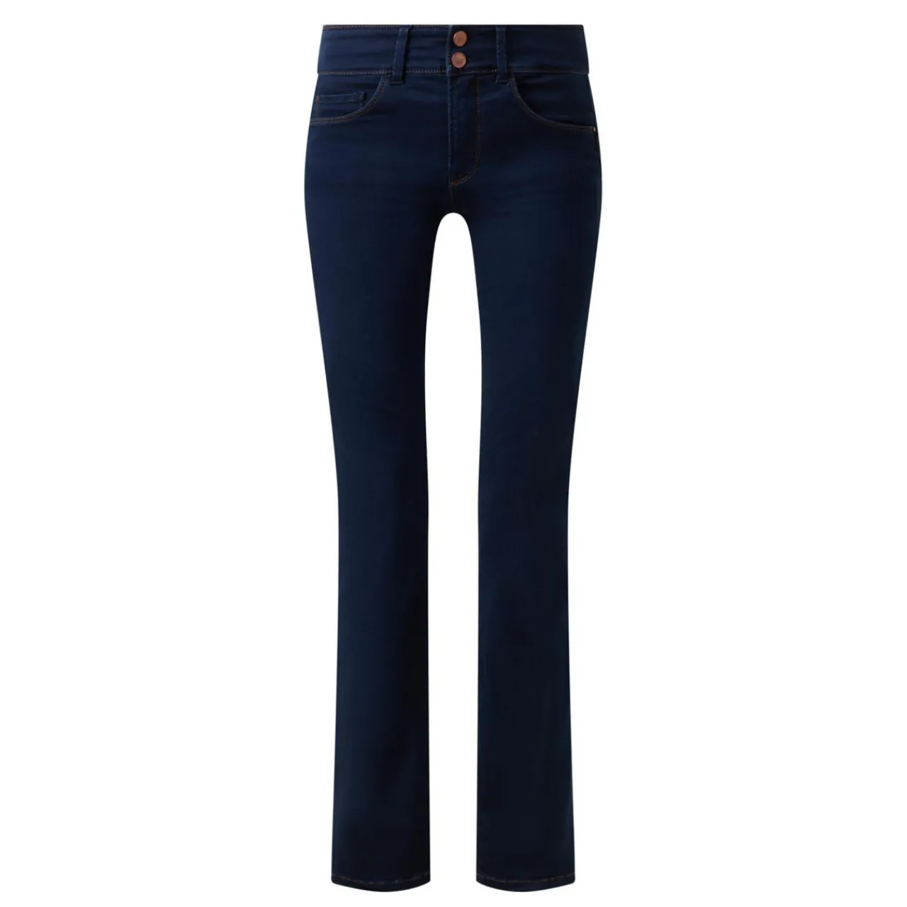 - Bootcut leg, high waist, zip fly fastening, two button fastening, five pockets, belt loops.
