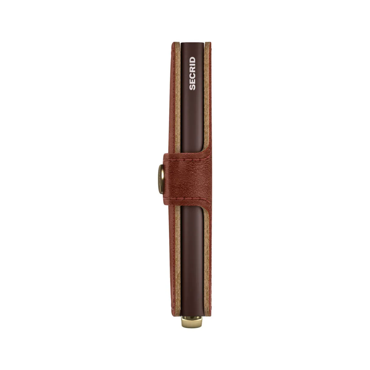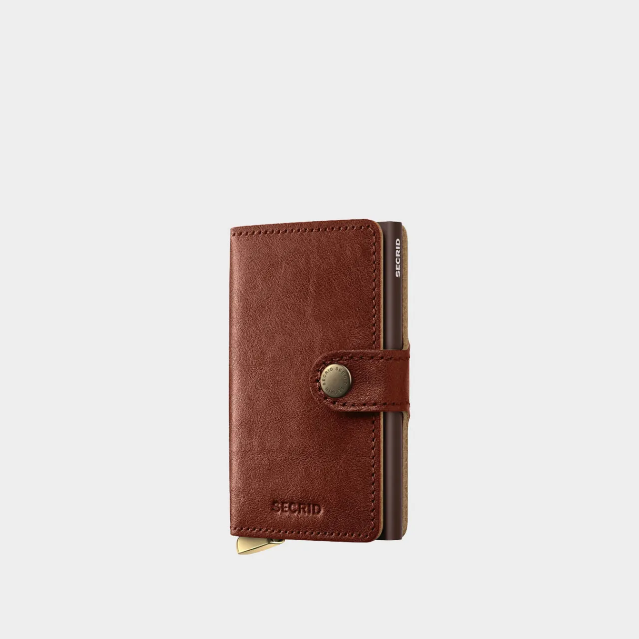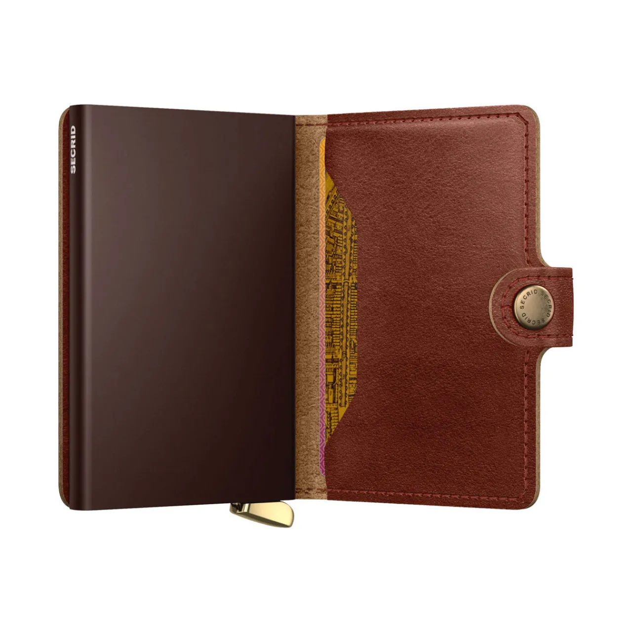 - Vegetable tanned leather finish, gold-tone hardware, brand logo detail, fold-over button closure, aluminium Cardprotector case, slide mechanism
