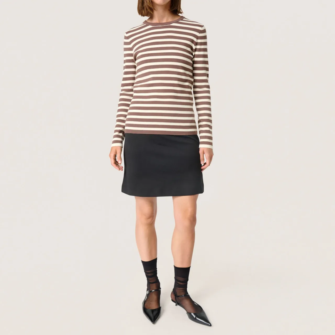 - Crew neckline, striped pattern, long sleeves, pull-on style