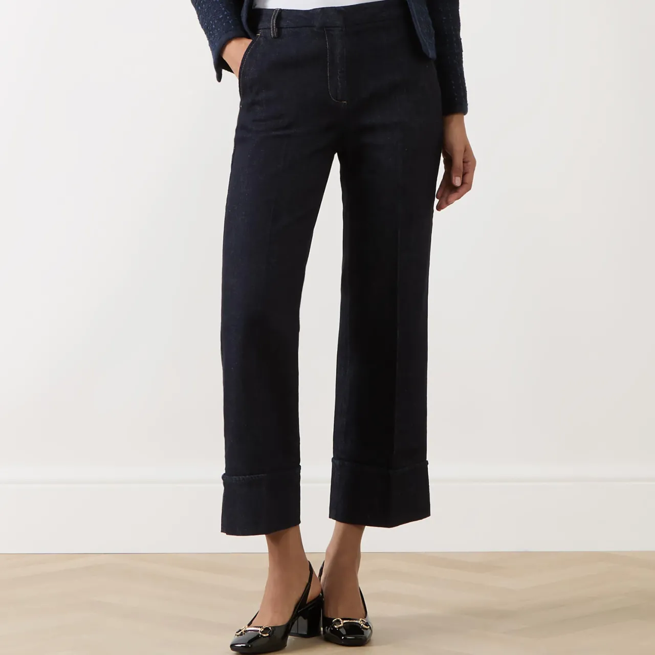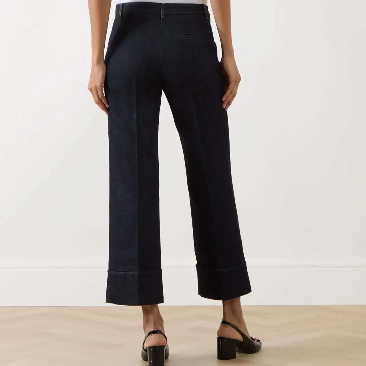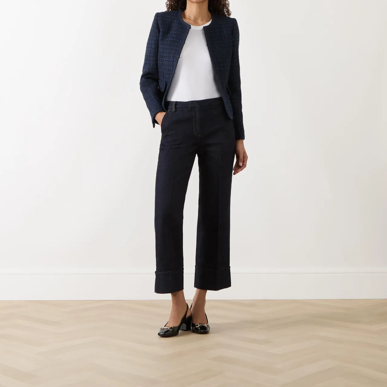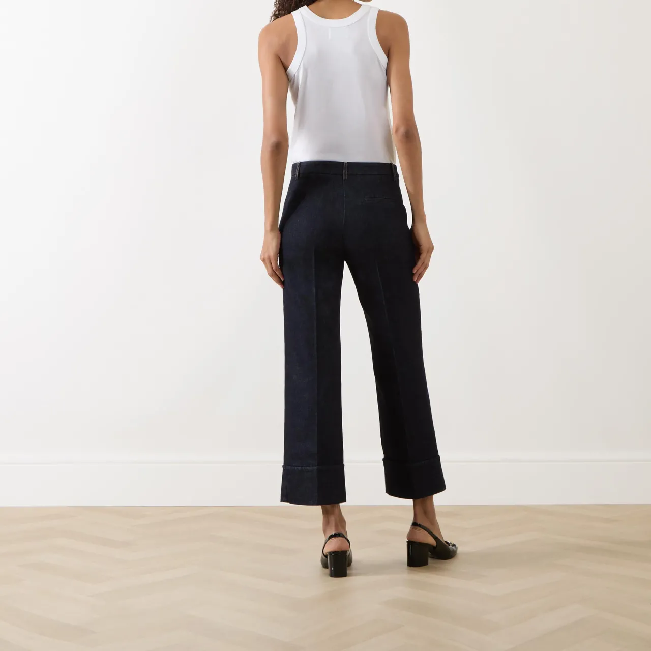 - Concealed zip-fly and button fastening, belt loops, two side in-seam pockets, contrast top stitching, mid-rise, flared-cut leg, pressed creases, smooth fabric