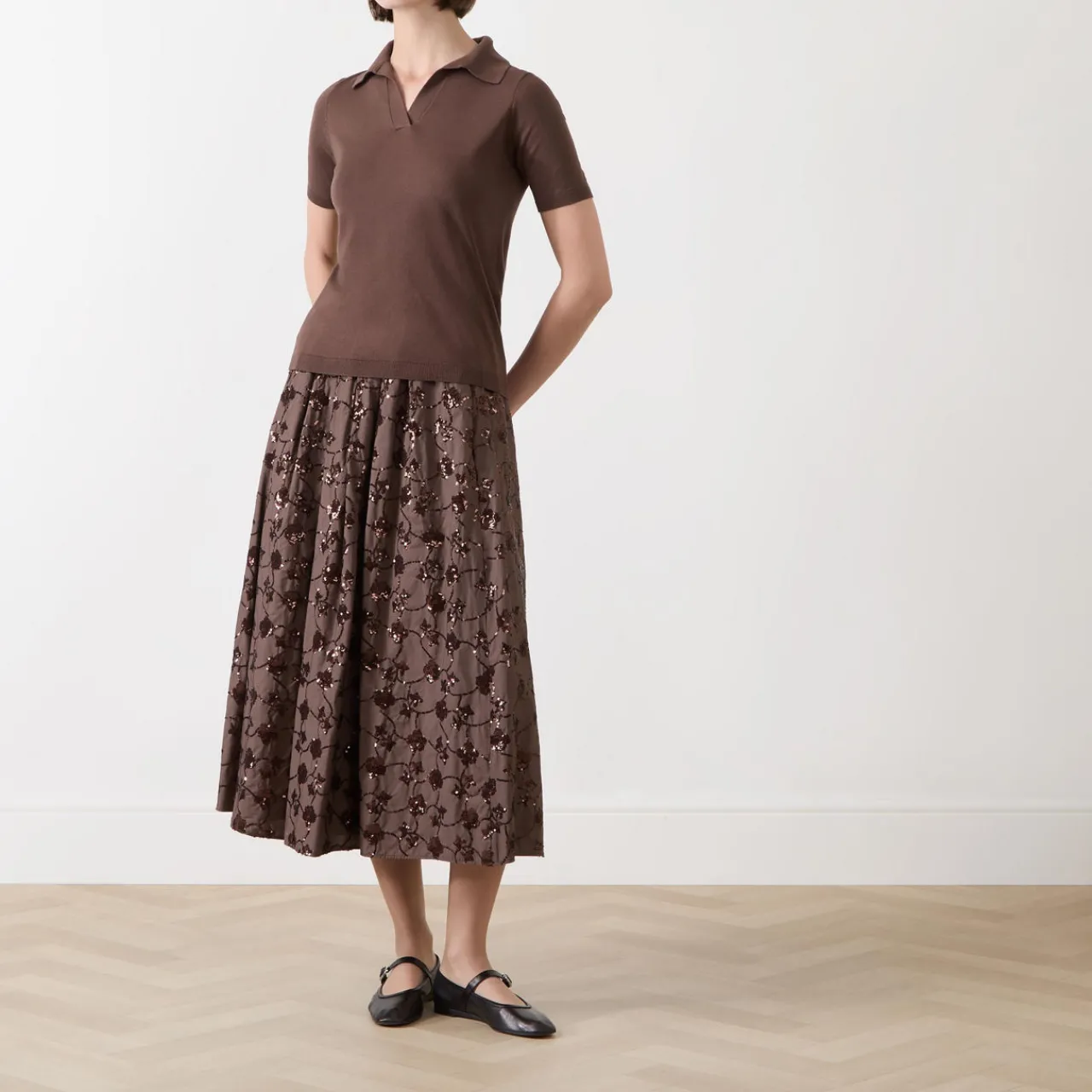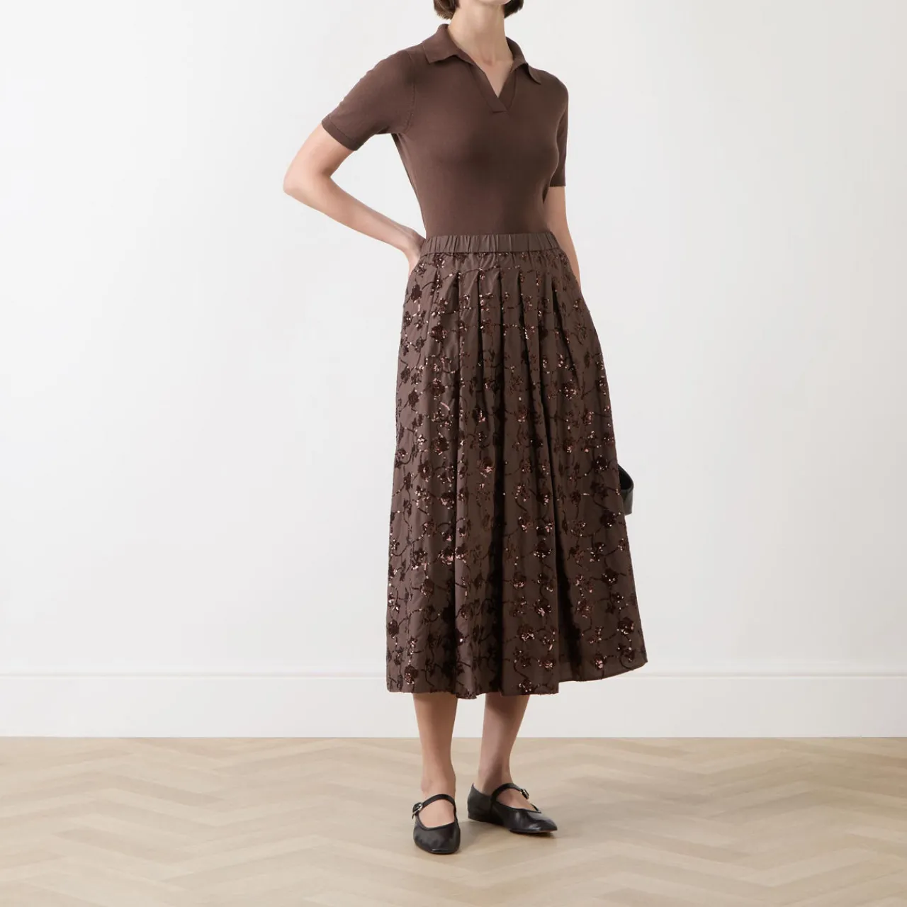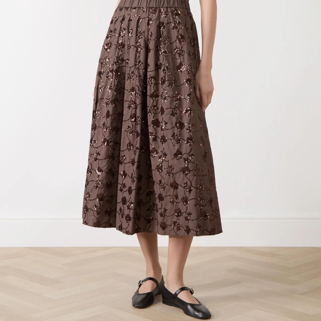 - Elasticated waistband, midi length, comfort fit, lined, embroidered and sequin detailing