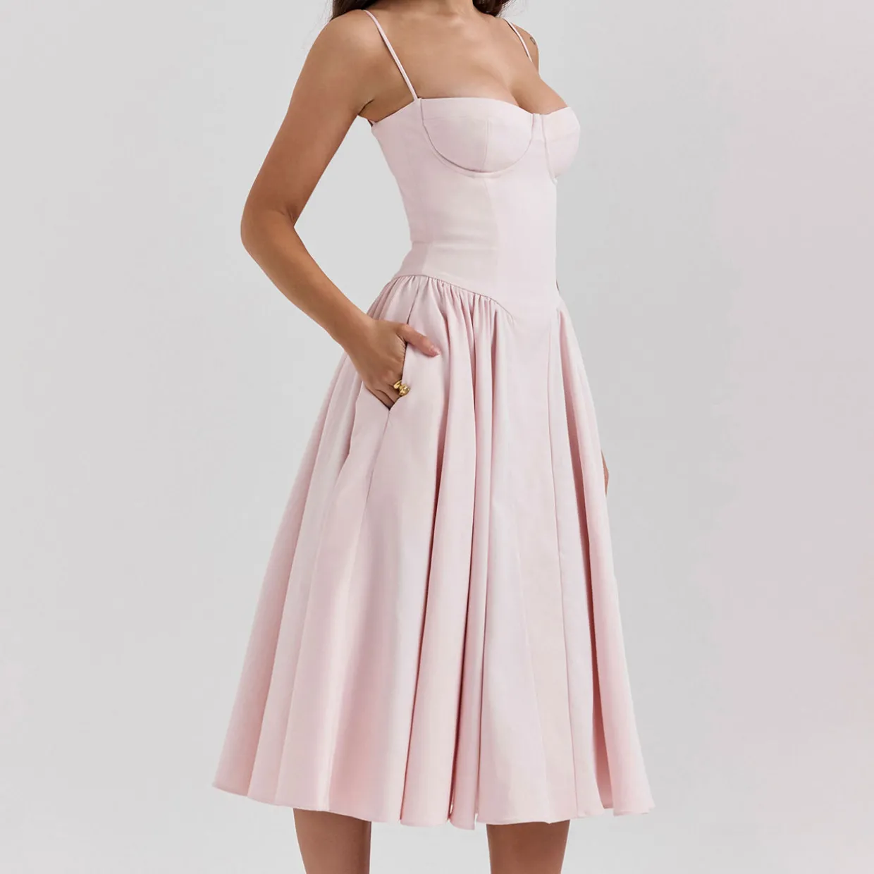 - Cut from a stretch twill fabric, boned through the bodice to cinch the waist, sweetheart neckline with underwired cups, adjustable barely there straps, gathering adds pretty volume to the midi skirt