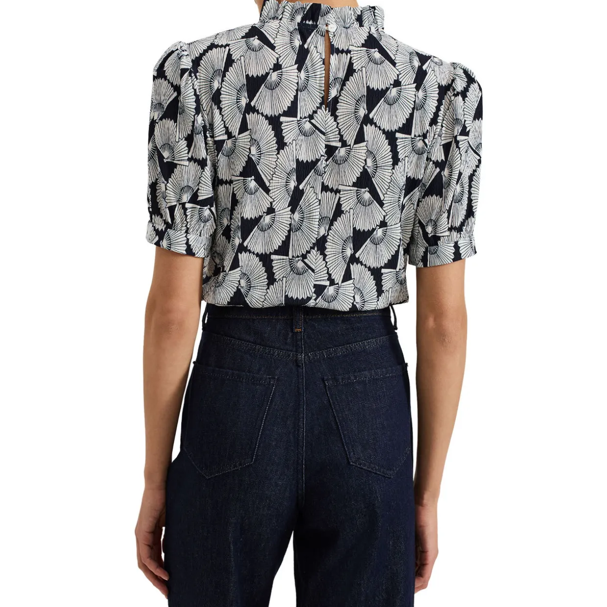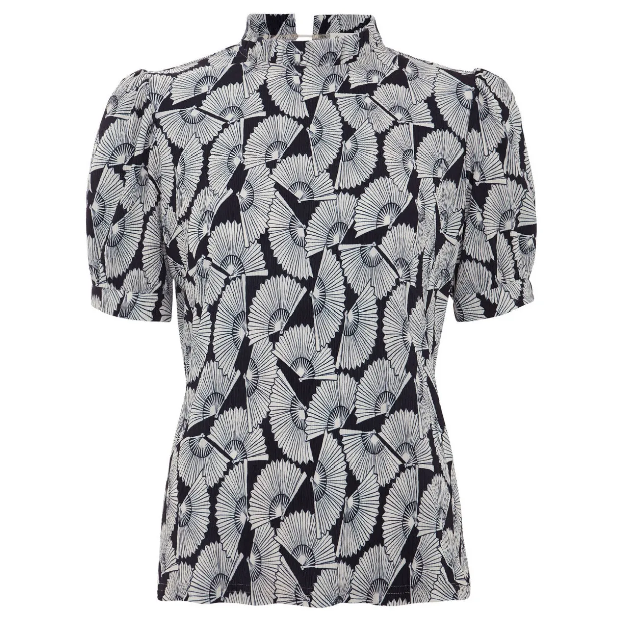 - Fan print, lightweight plisse material, textured finish, ruffled collar neckline, short sleeves, keyhole and button fastening