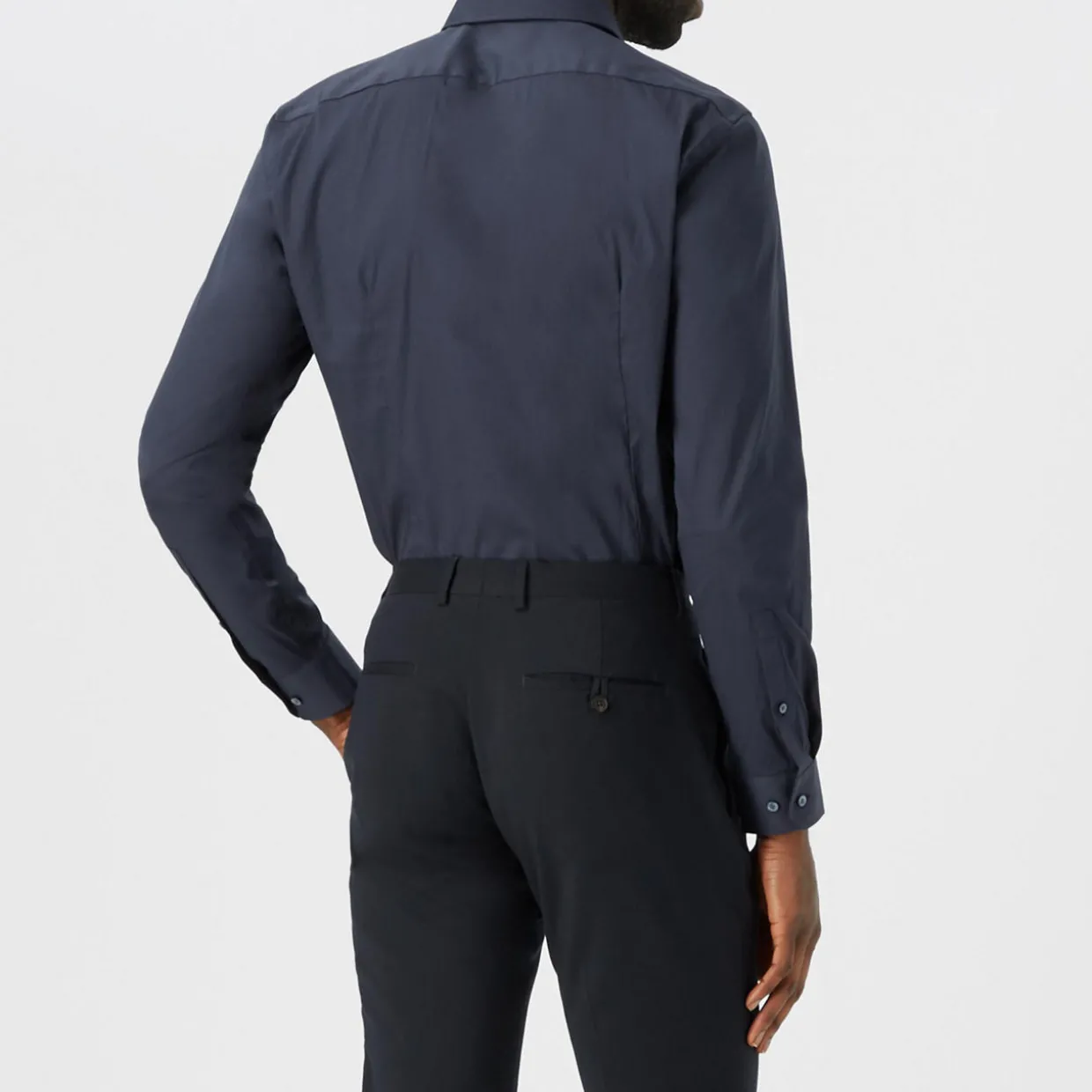 - Long sleeves, pointed collar, button fastenings, structured cuffs