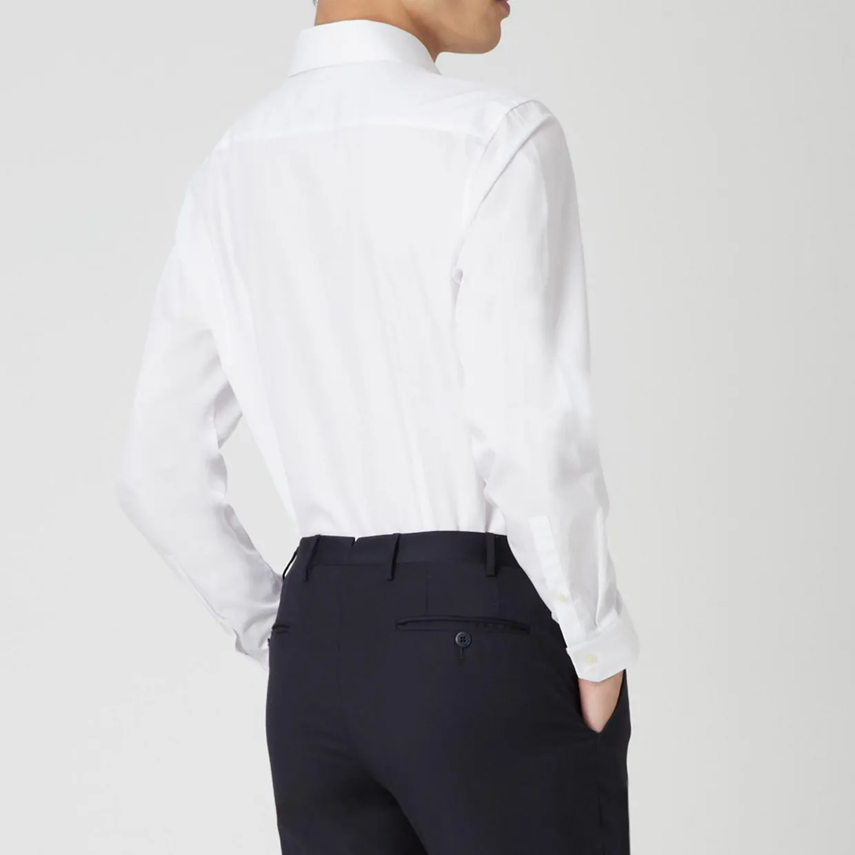 - Long sleeves, pointed collar, button fastenings, structured cuffs.