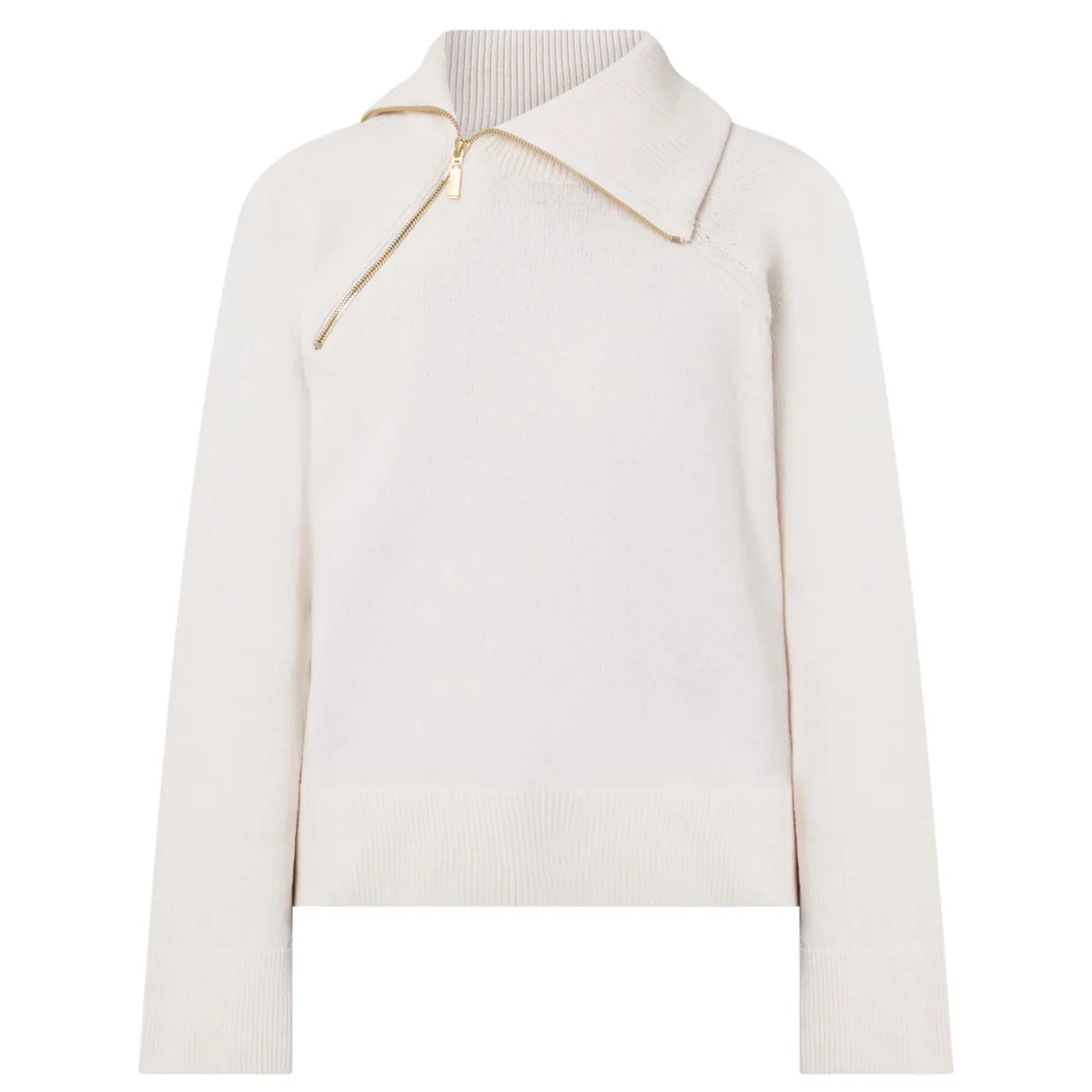 - Asymmetric zip fastening, adjustable neckline, long sleeves, straight hemline, ribbed trims, knit structure, logo badge