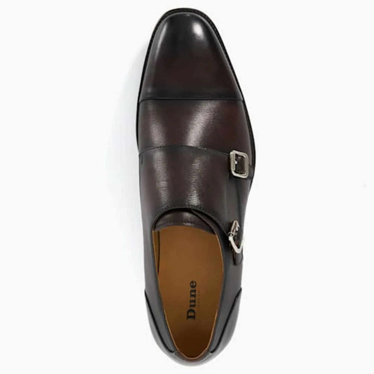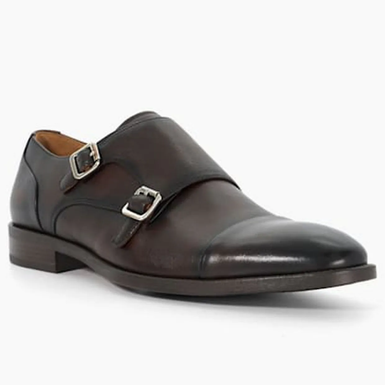 - Double monk strap, toe-cap, stacked heel, polished finish