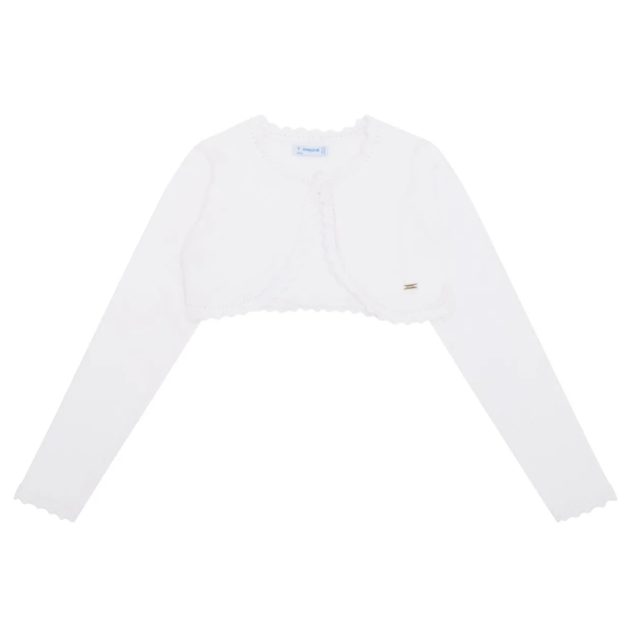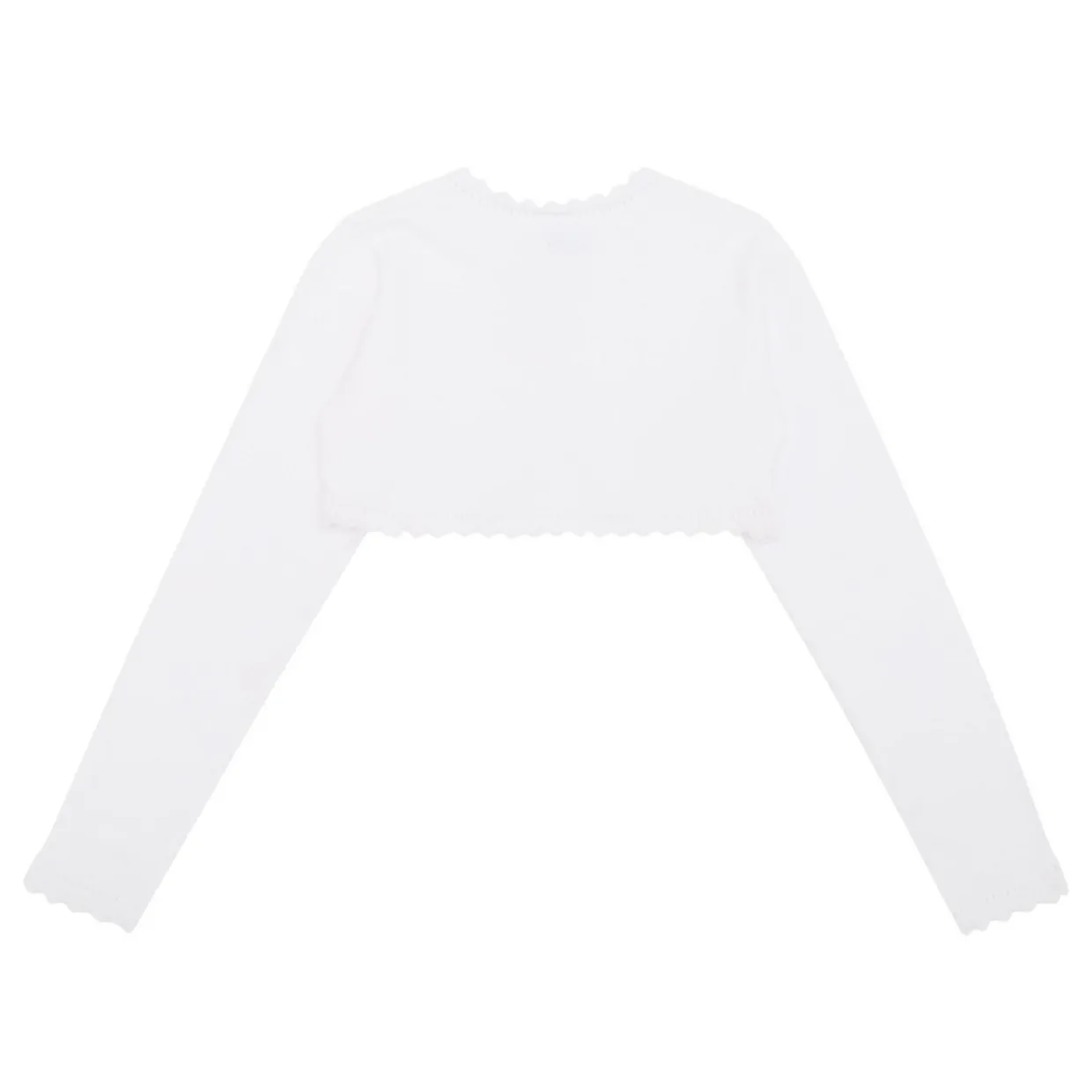 - Long sleeves, round neckline, button fastening, pointelle detailing, scalloped edges, knitted finish