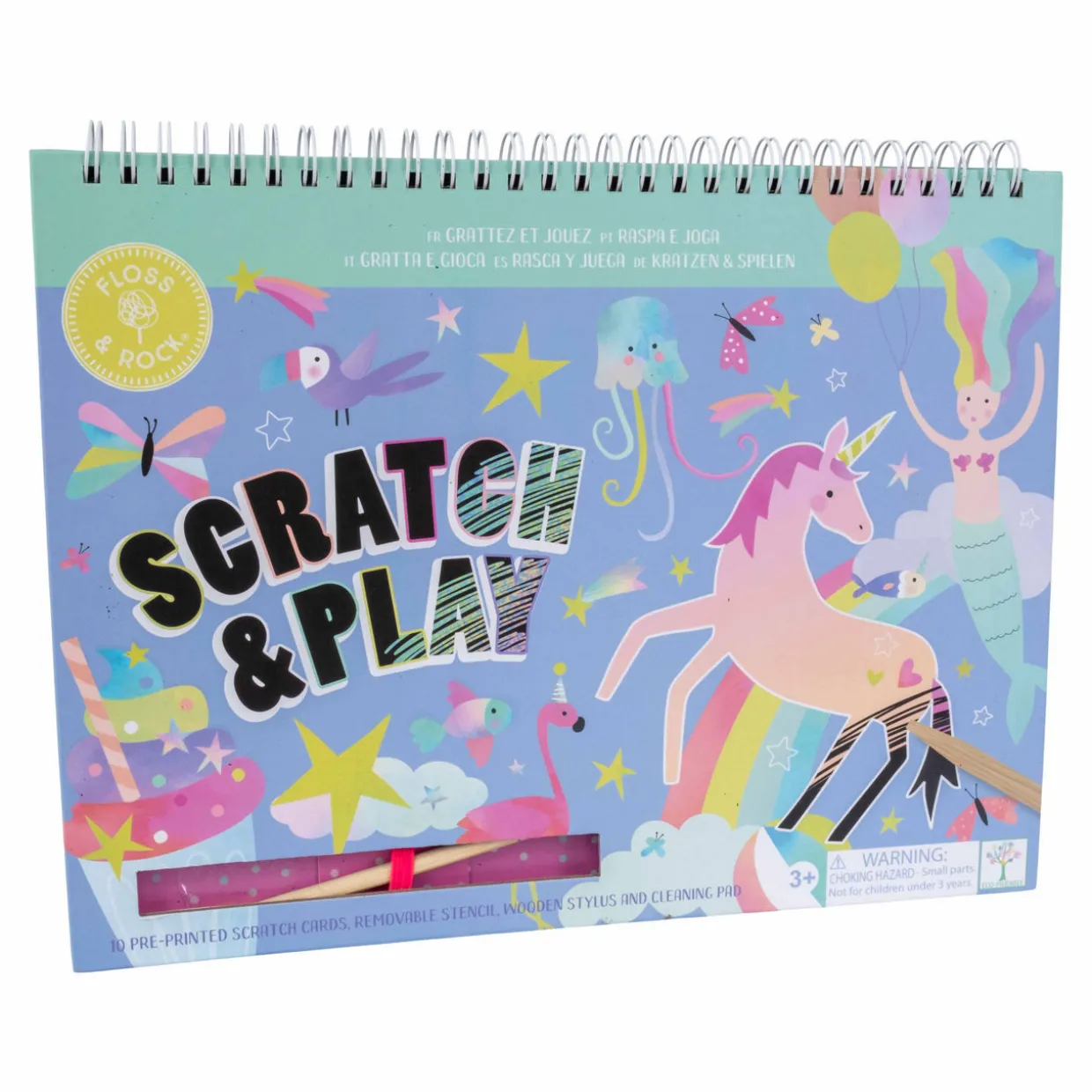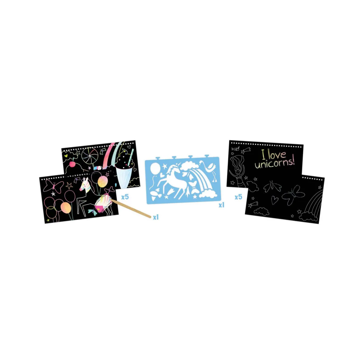 - 10 pre-printed scratch cards, 1 wooden stylus, 1 removable stencil sheet, spiral bound book