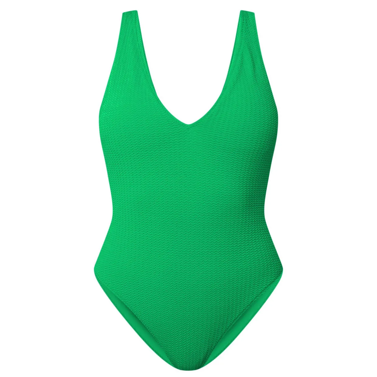 - One-piece design, plunging V-neckline, wide straps, low-cut back, seersucker fabric