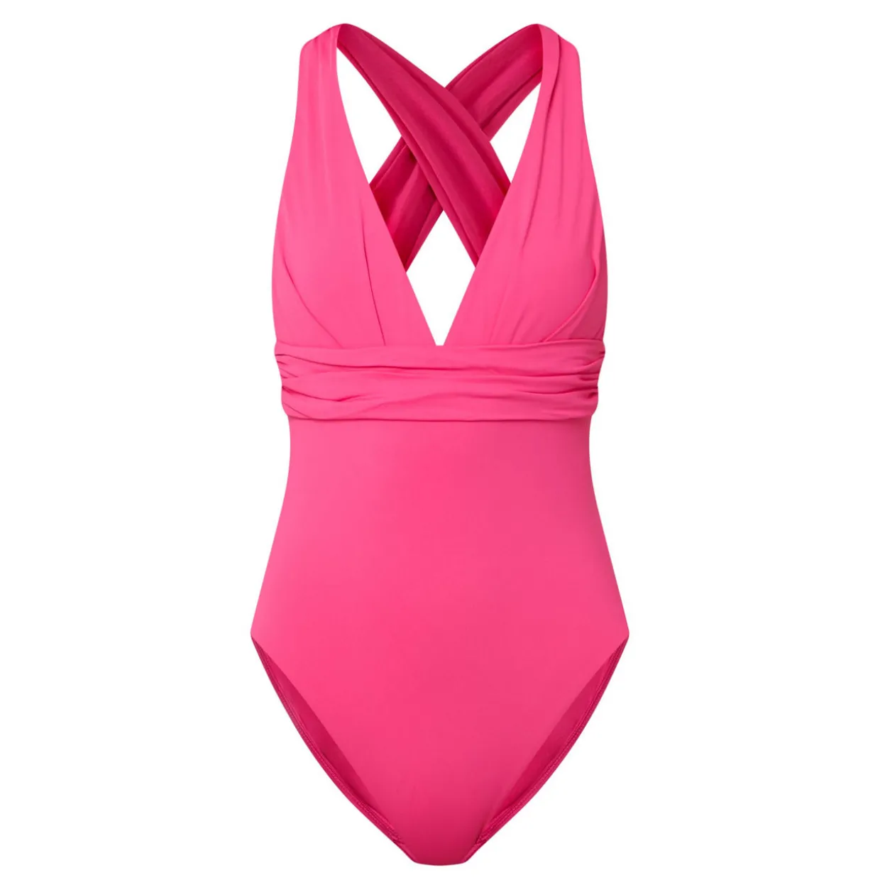 - Removable quick-dry cups, deep V-neck, cross back, rucked detailing