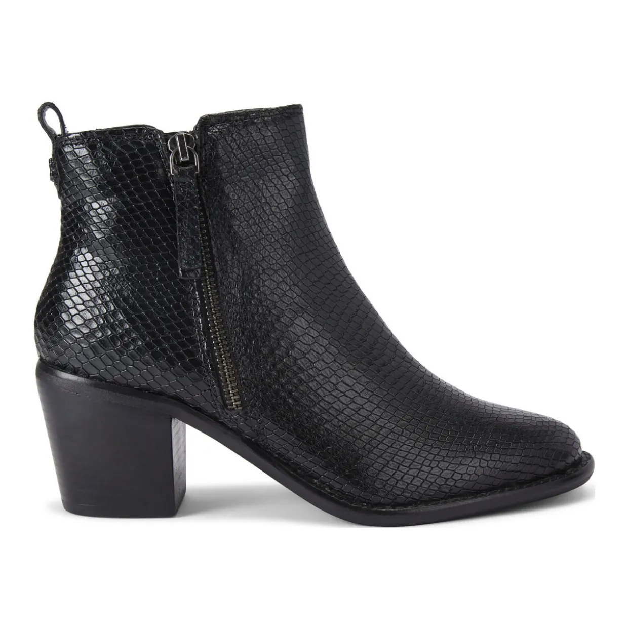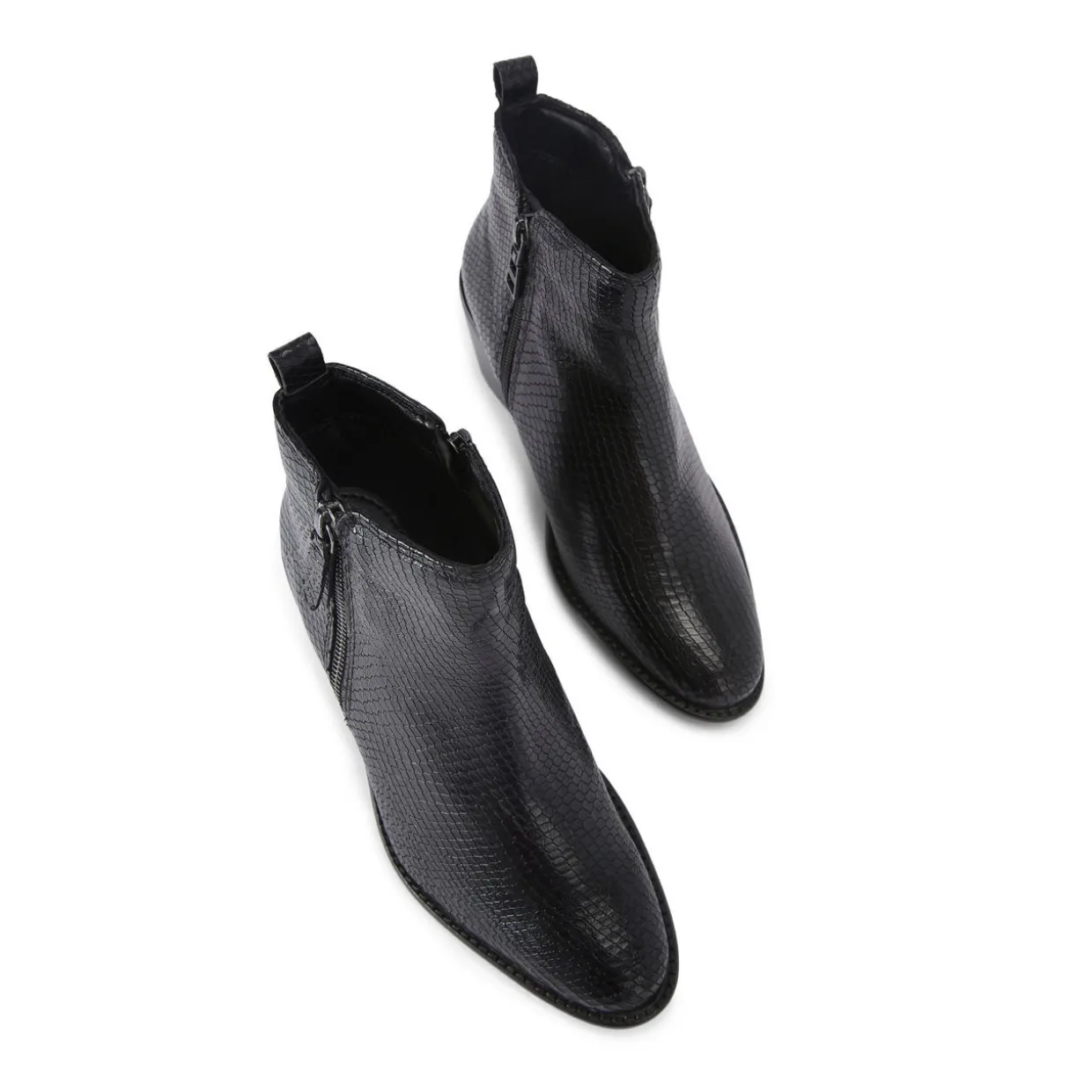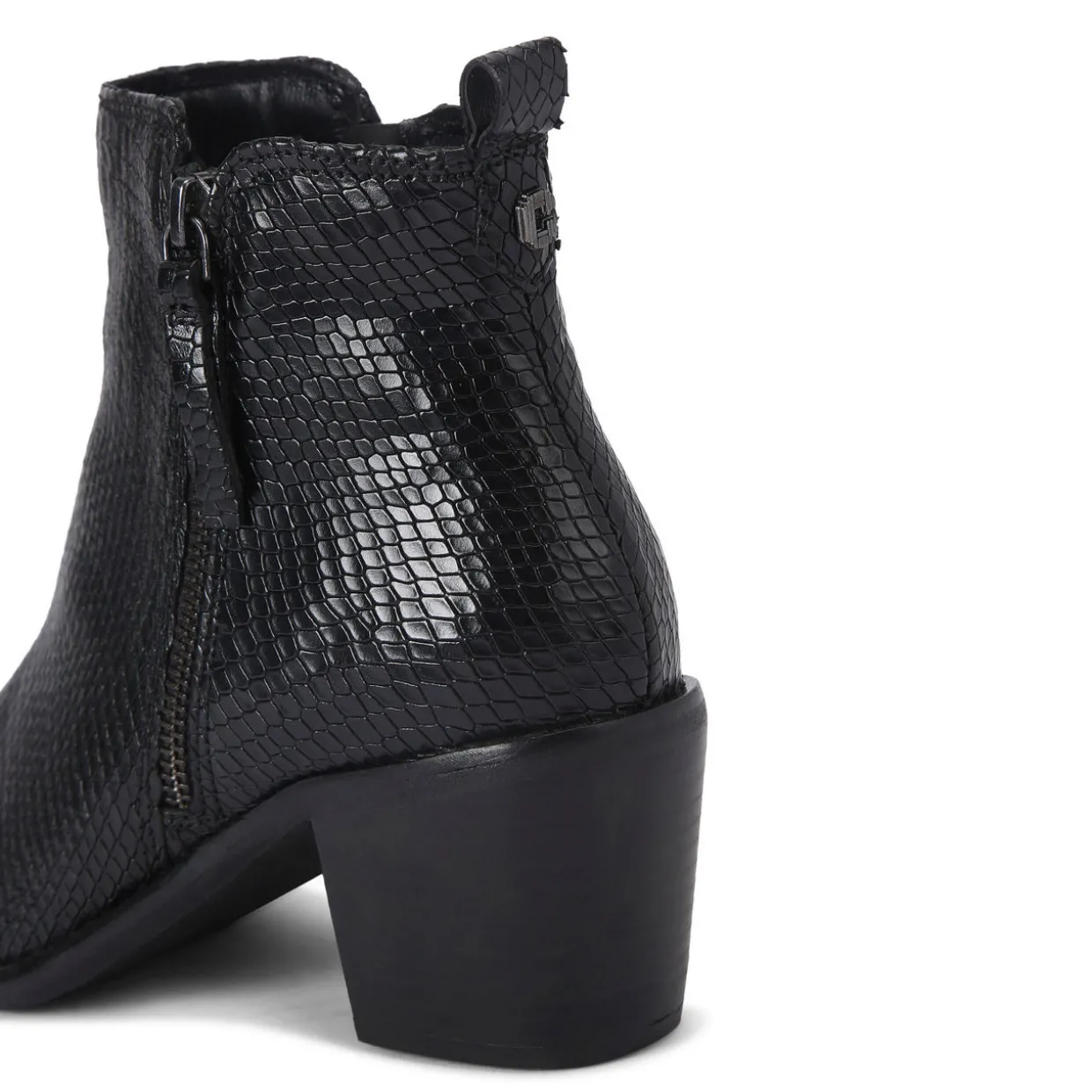 - Almond-shape toe, zip fastening, pull tabs, Cuban heel, gun metal-toned hardware, logo details, faux animal print embossed finish, All Day technology