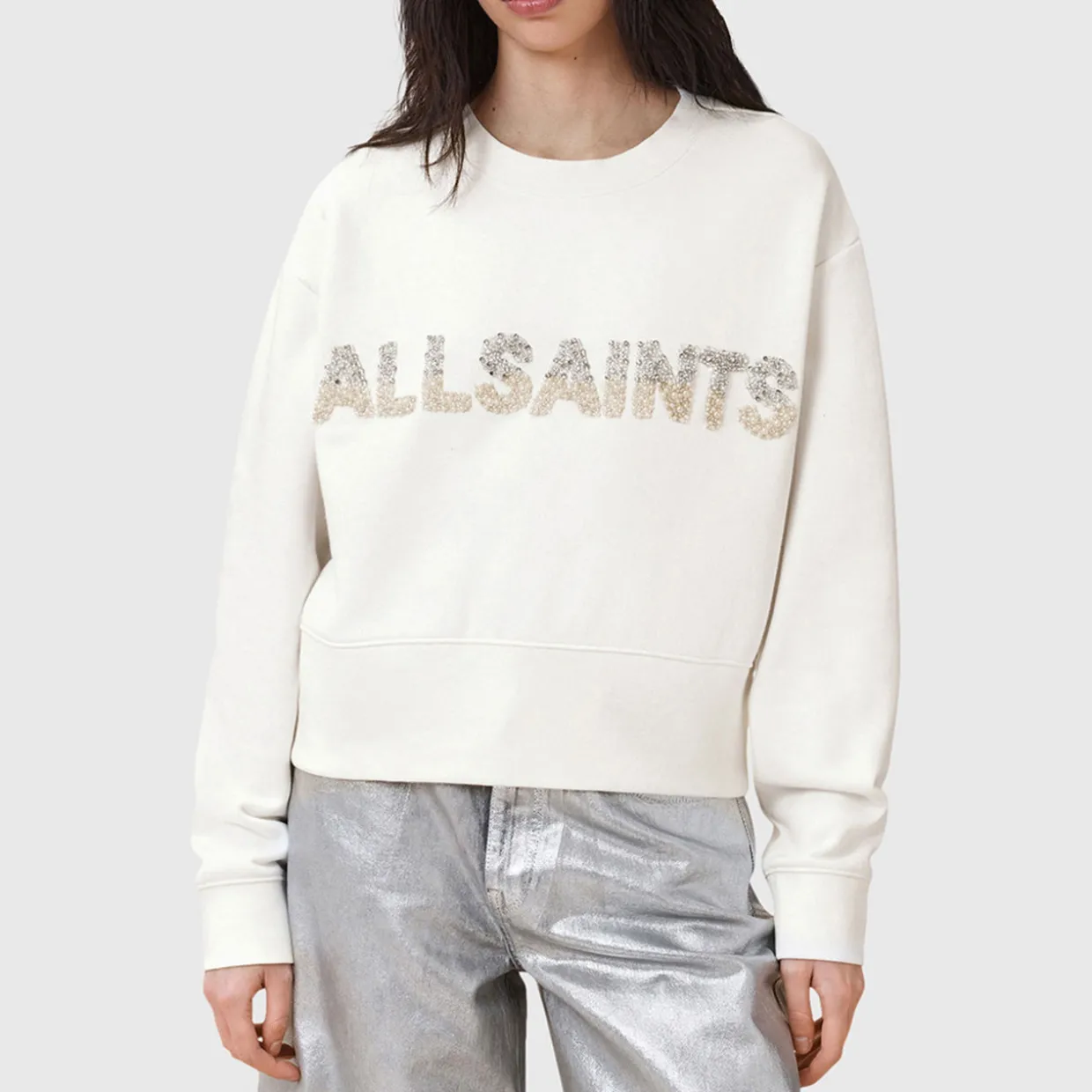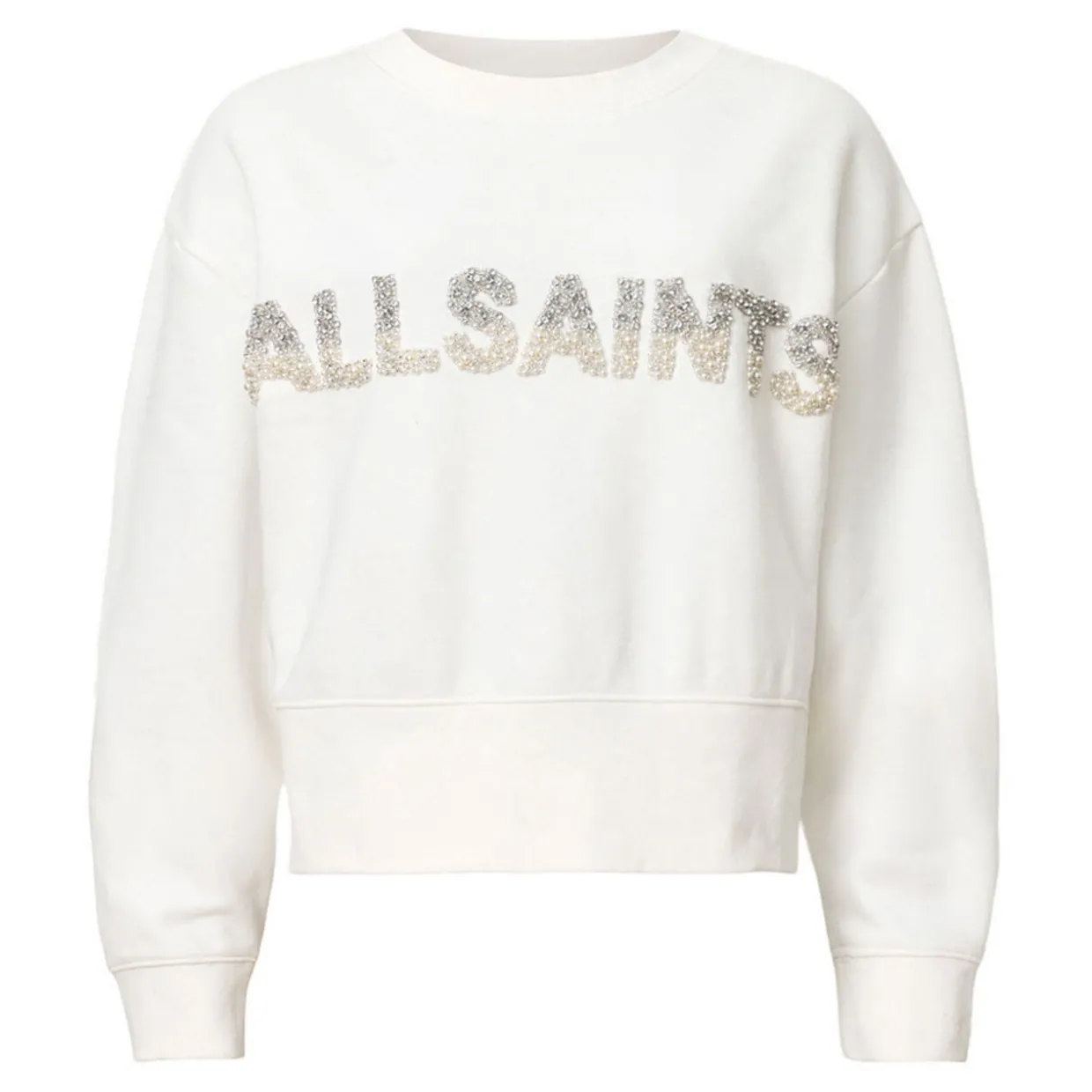 - AllSaints pearl embellished branding on the chest, long sleeves, dropped shoulders, round neckline