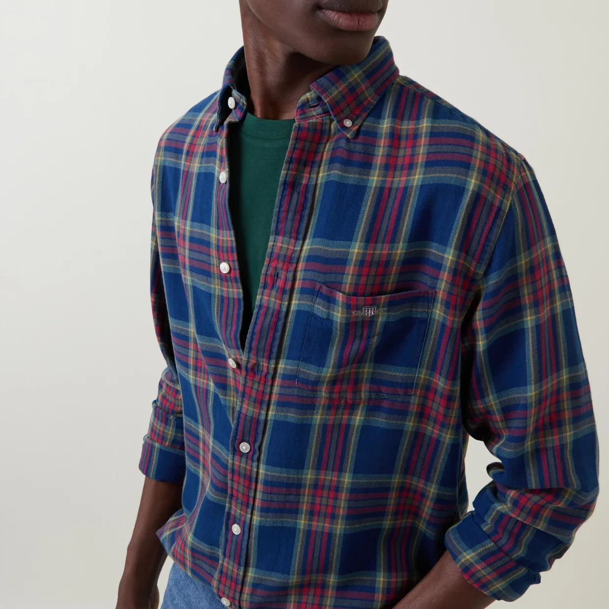 - Button-down collar, long sleeves, shield logo, button fastenings, curved hemline