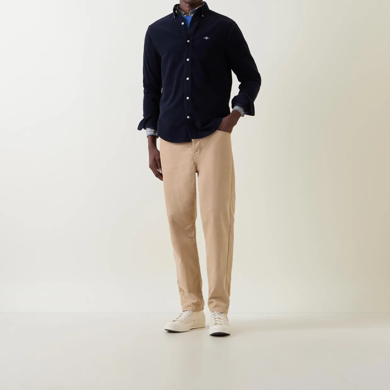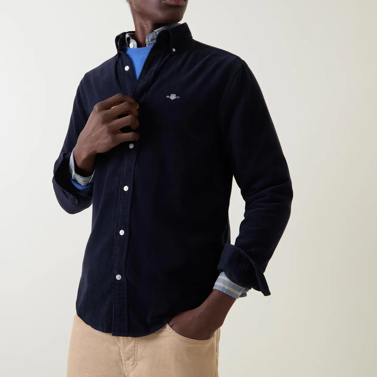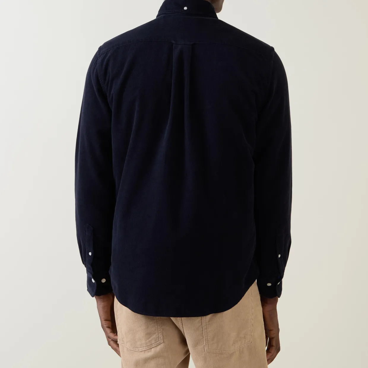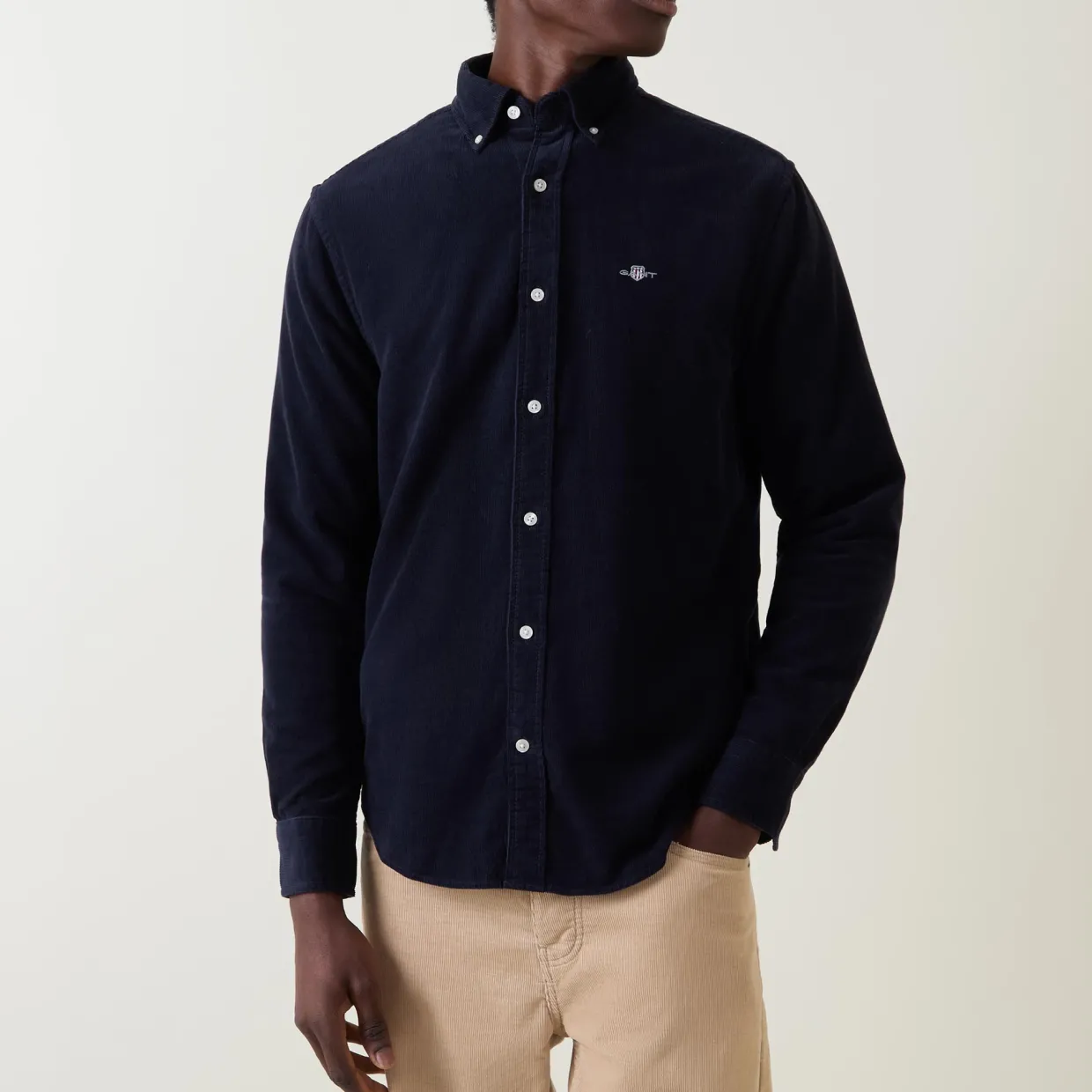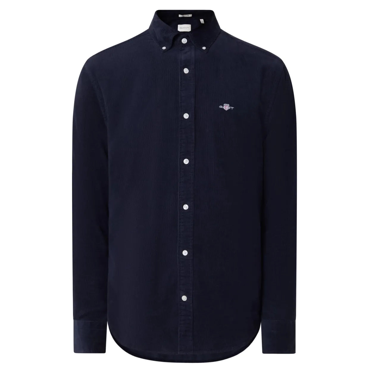 - Corduroy texture, long sleeves, shield logo, curved hemline, button fastenings, button-down collar