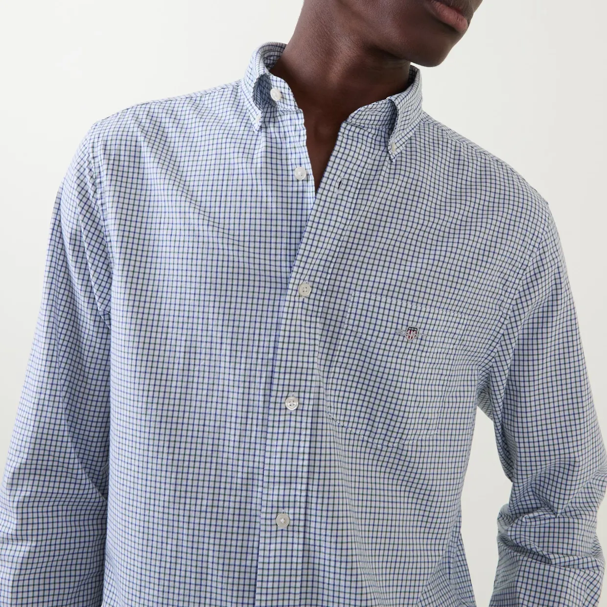 - Button-down collar, long sleeves, button fastenings, curved hemline, logo detail, chest pocket