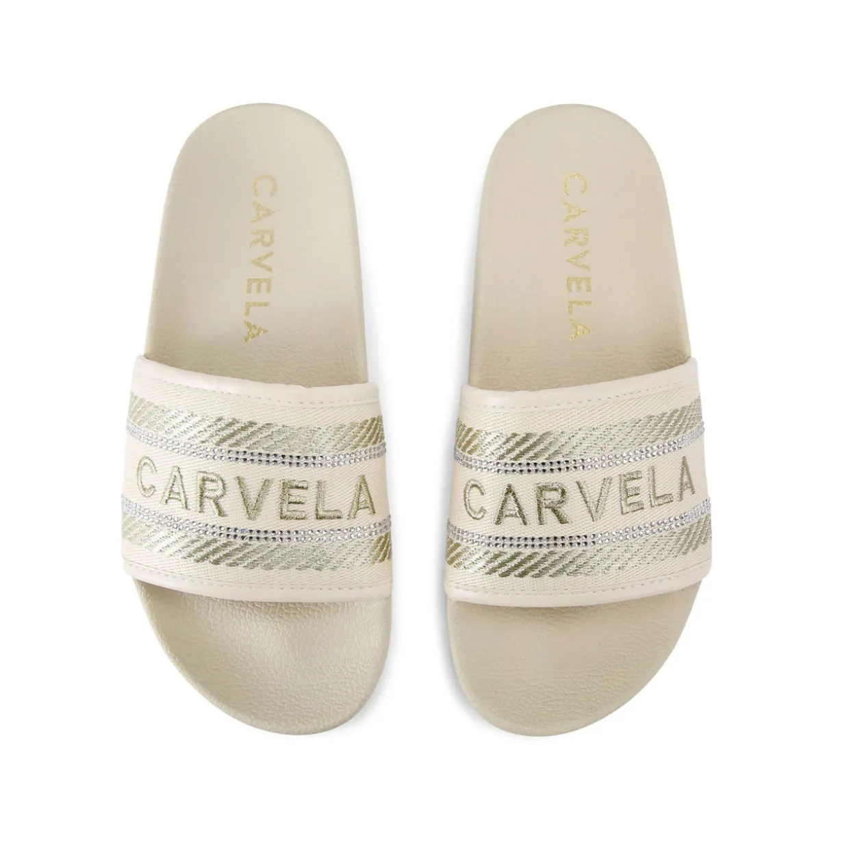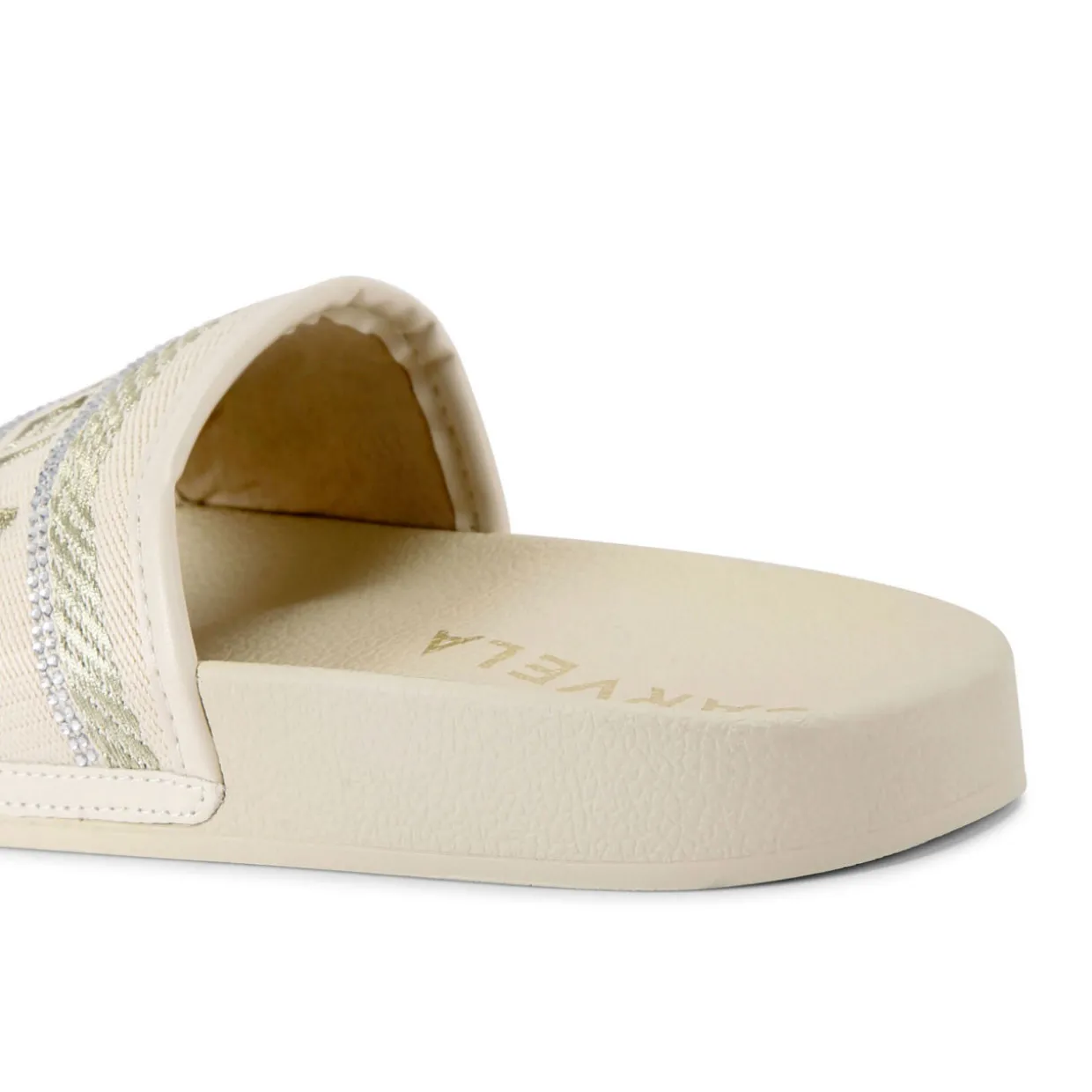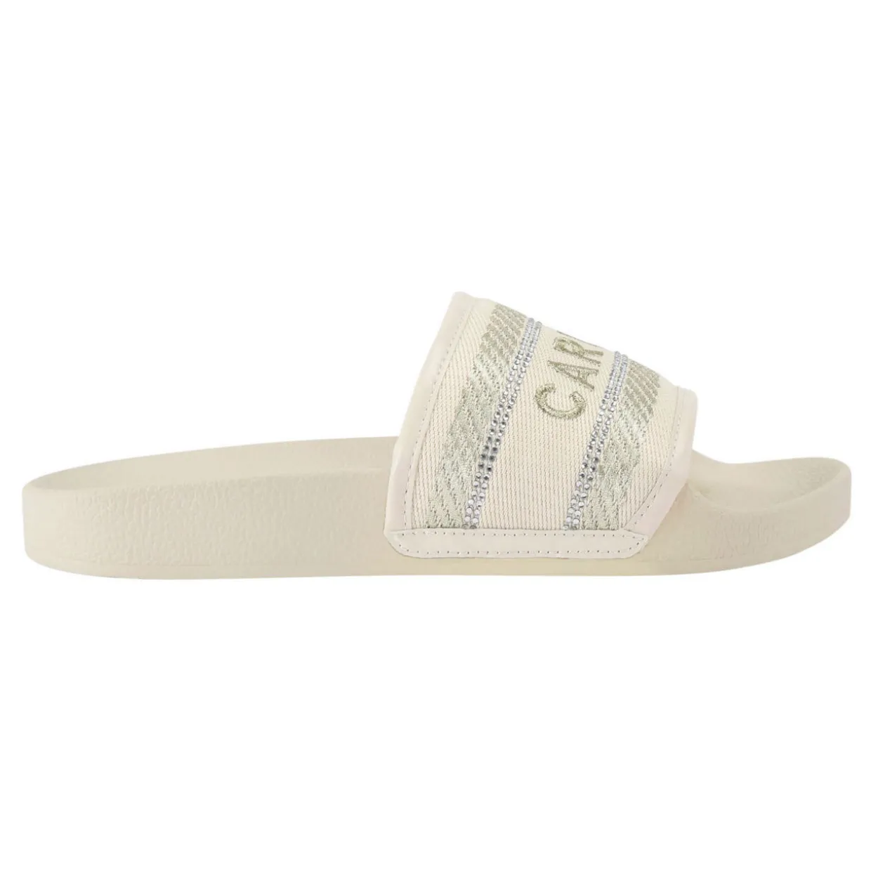 - Round open toe, fabric stitched upper, tonal logo detailing, crystal embellishments, slip on style