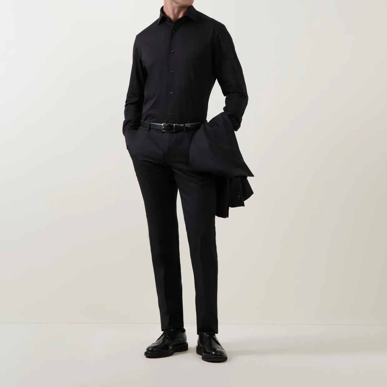 - Long sleeves, cutaway collar, button fastening, tonal stitching, single-button cuffs, curved hemline, smooth fabric
