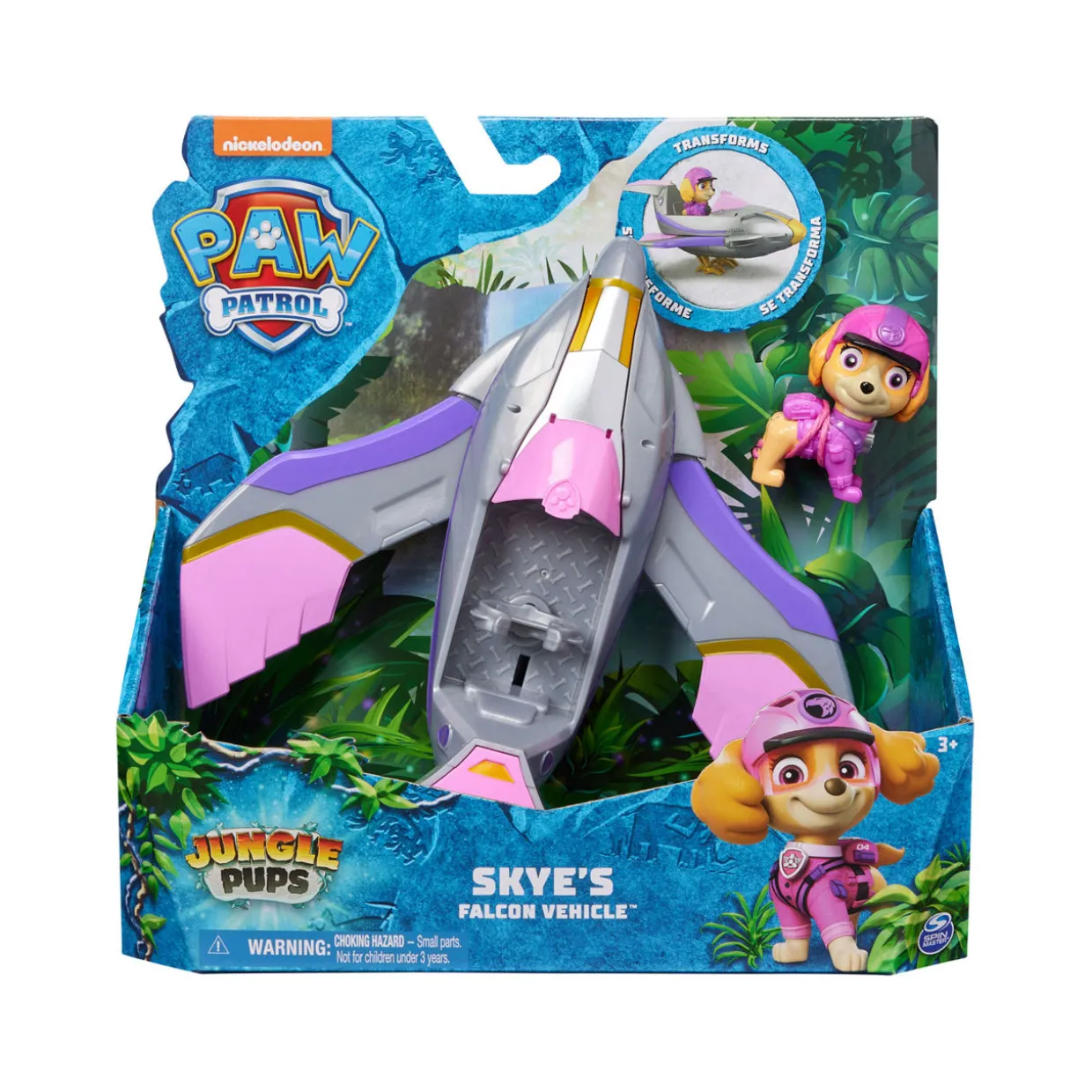 - Includes one Skye character and one transforming toy jet, push down on the front of Skye’s jet to pop out her vehicle’s wings and fold out the beak, then rotate the talons down to let the falcon stand on its own and clear away obstacles
