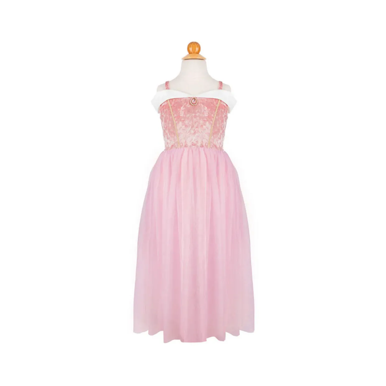- Inspired by Sleeping Beauty, soft velvet top, spaghetti straps, contrast white trim, gem detail at the centre front, detachable arm warmers, full-length dress, flowing tulle skirt