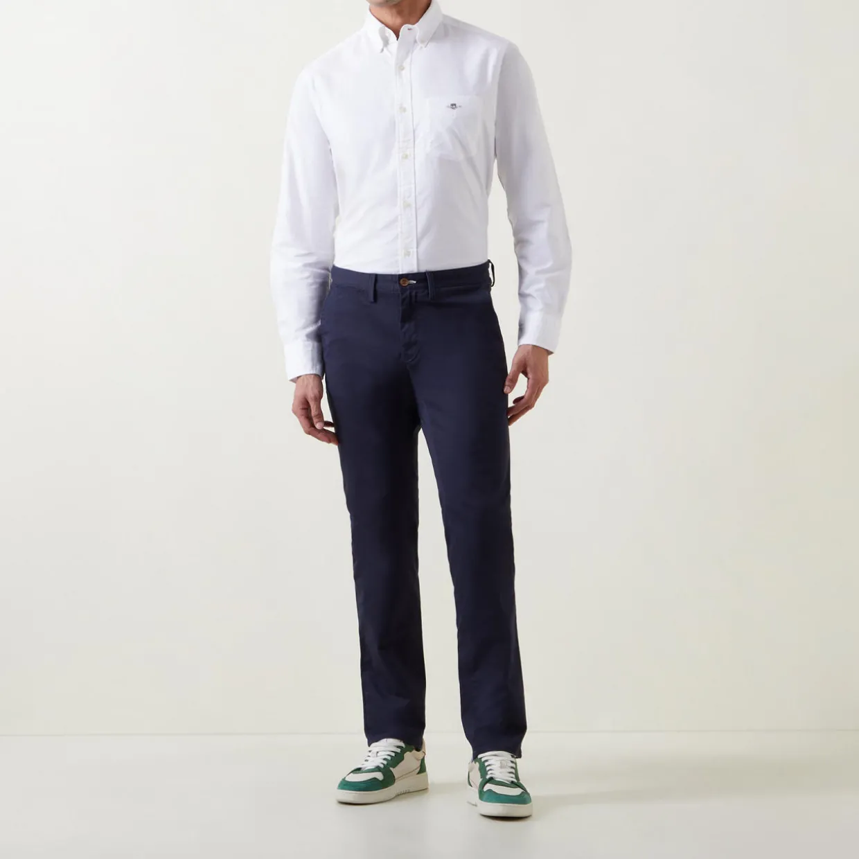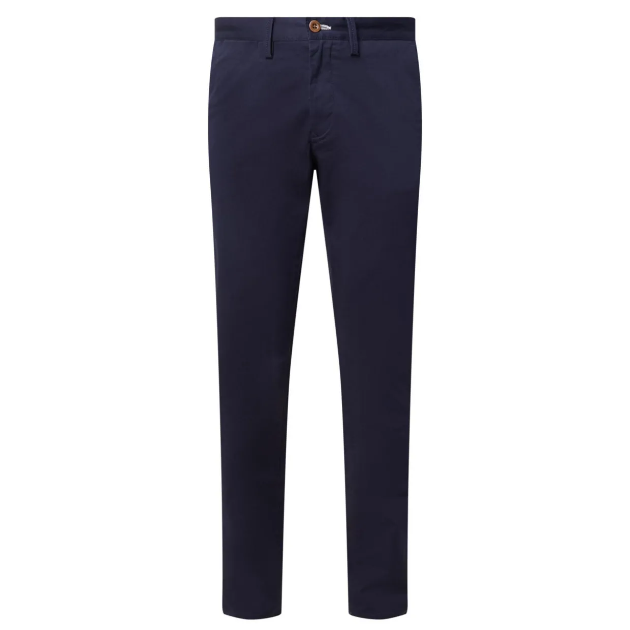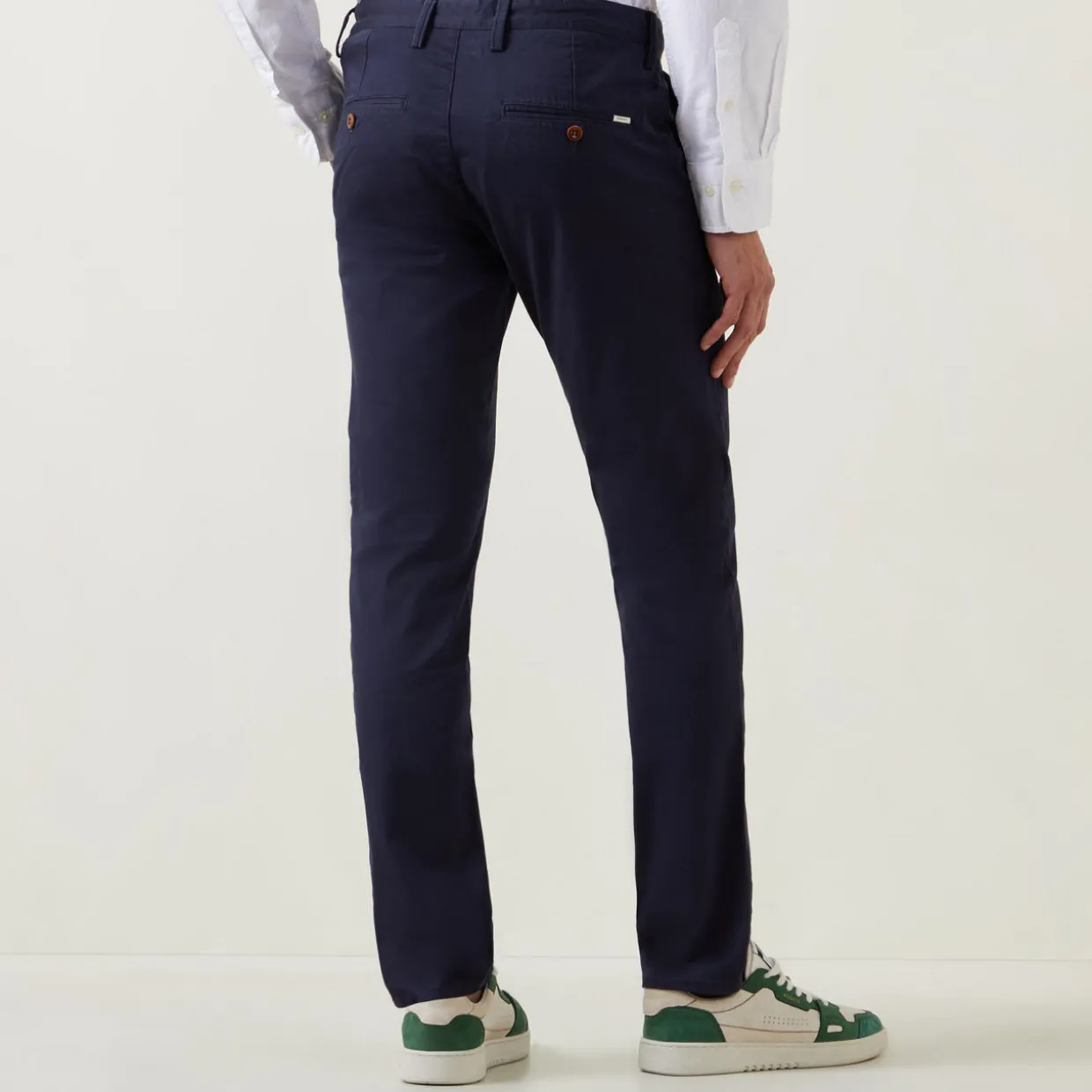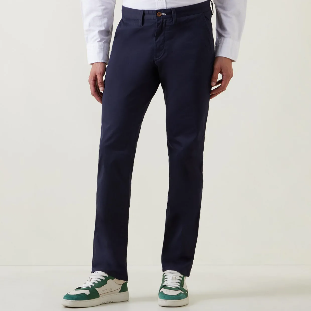 - Mid-rise, slim-fit, chambray interior waistband, coin pocket, two side slit pockets, two rear welt pockets with button closure, logo detail