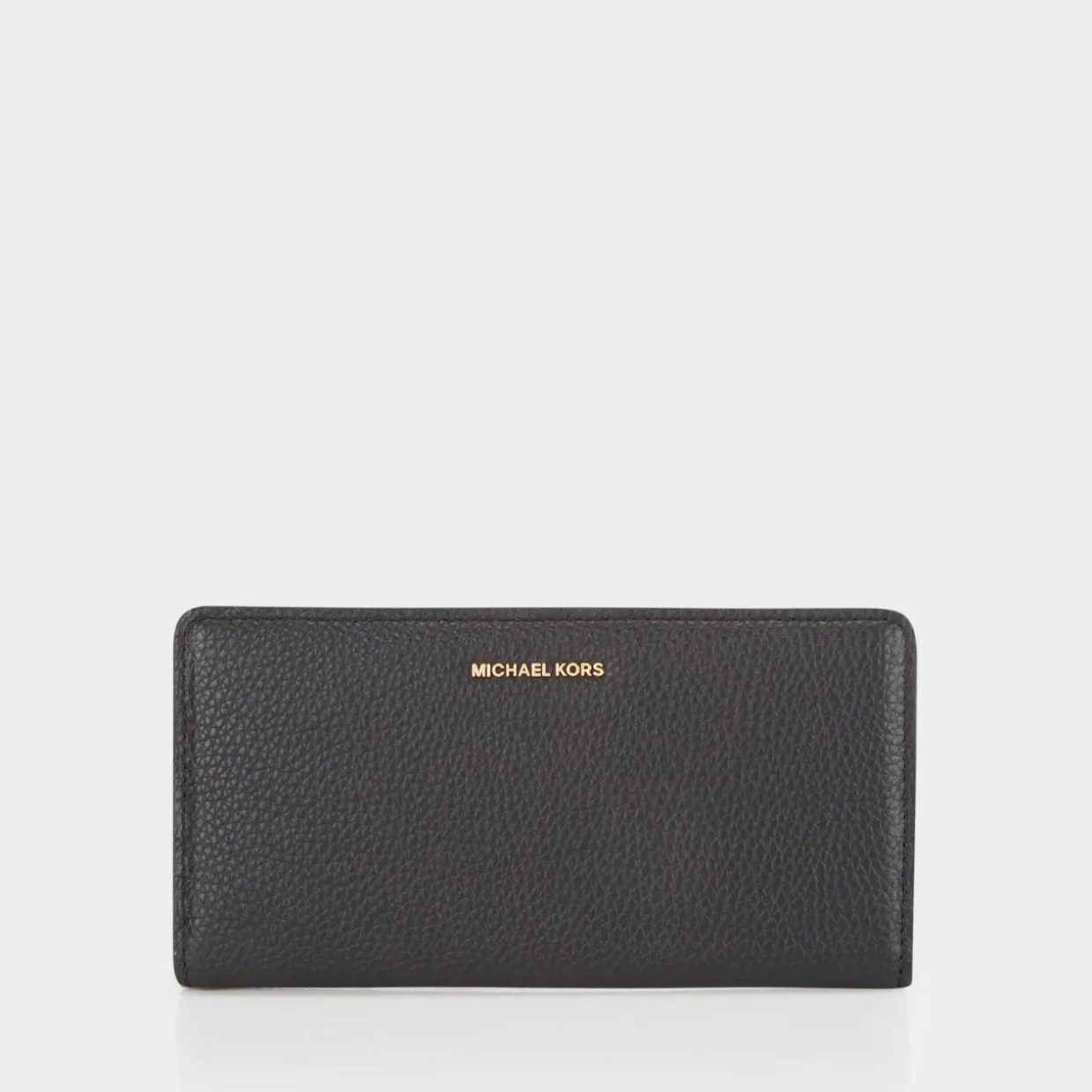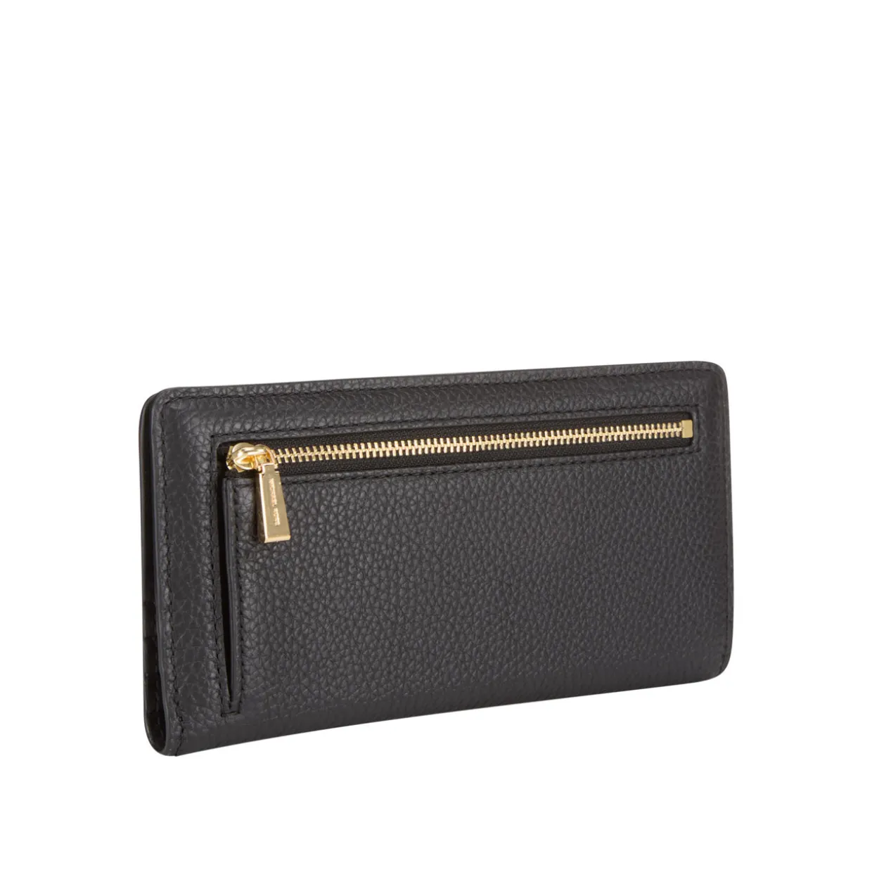 - Logo lettering to the front, slim shape, secure snap-button fastening, back zip-fastening pocket, gold-tone hardware, grained leather finish