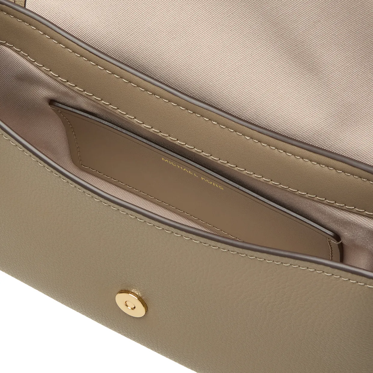 - Detachable adjustable crossbody strap, foldover flap closure, snap-button fastening, front logo lettering, gold-tone hardware, tonal stitching, grained leather finish