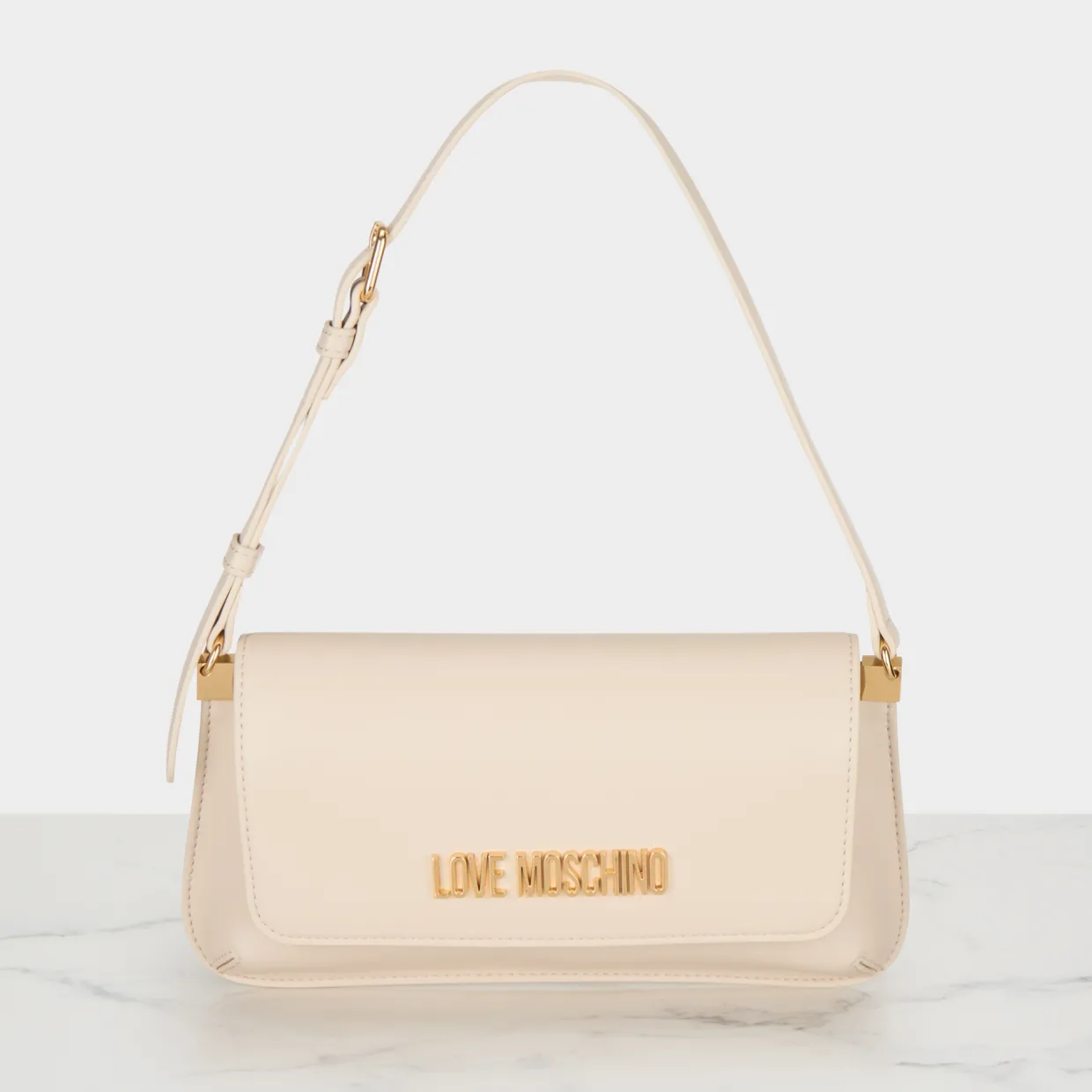 - Flap closure with magnetic snap fastening, adjustable shoulder strap, logo lettering, gold-tone hardware, tonal stitching, smooth finish