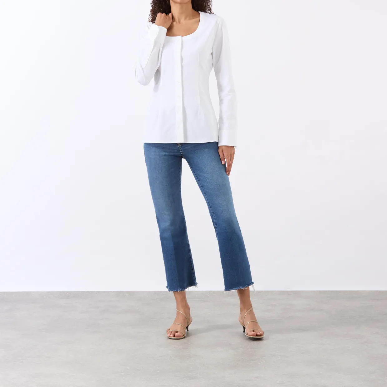 - Zip-fly and button fastening, belt loops, five-pocket design, contrast top stitching, whiskering and faded detailing, pressed creases, frayed hems, smooth denim finish