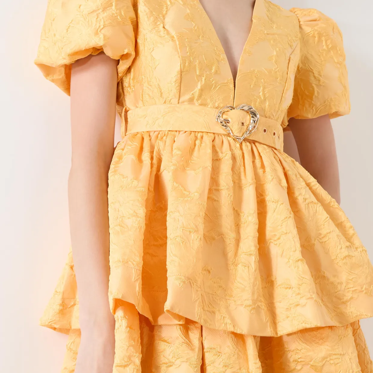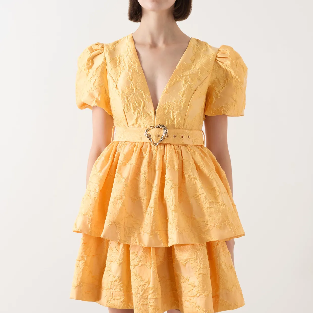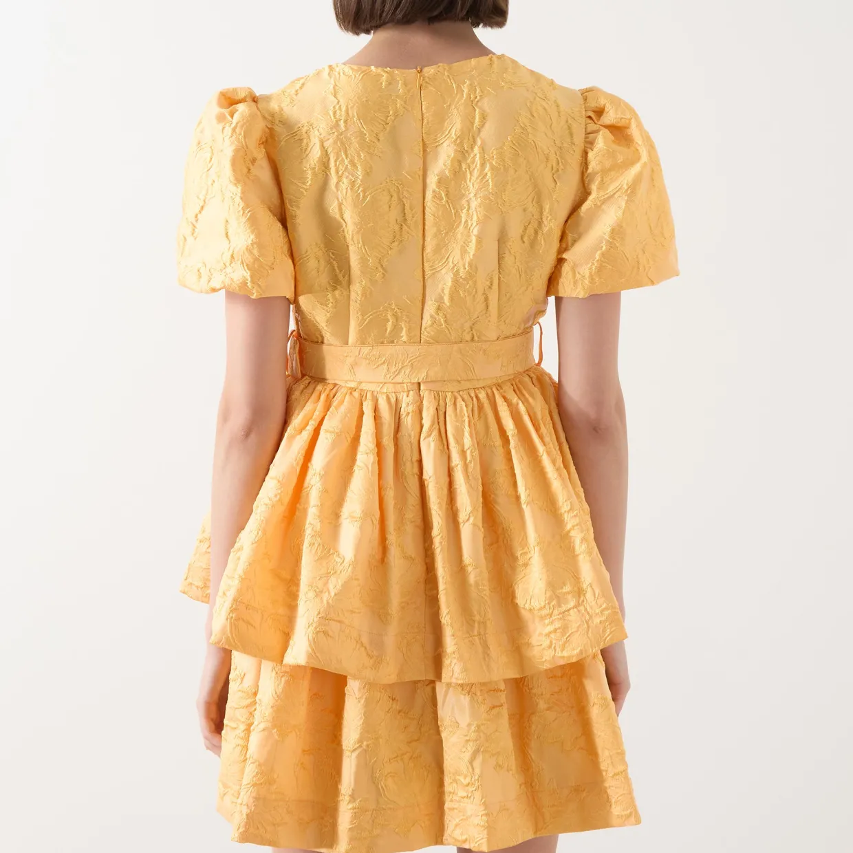 - Mini length, floral jacquard design, concealed hook and eye fastening, fully lined, matching belt, gold-toned hardware, V-neckline, short sleeves