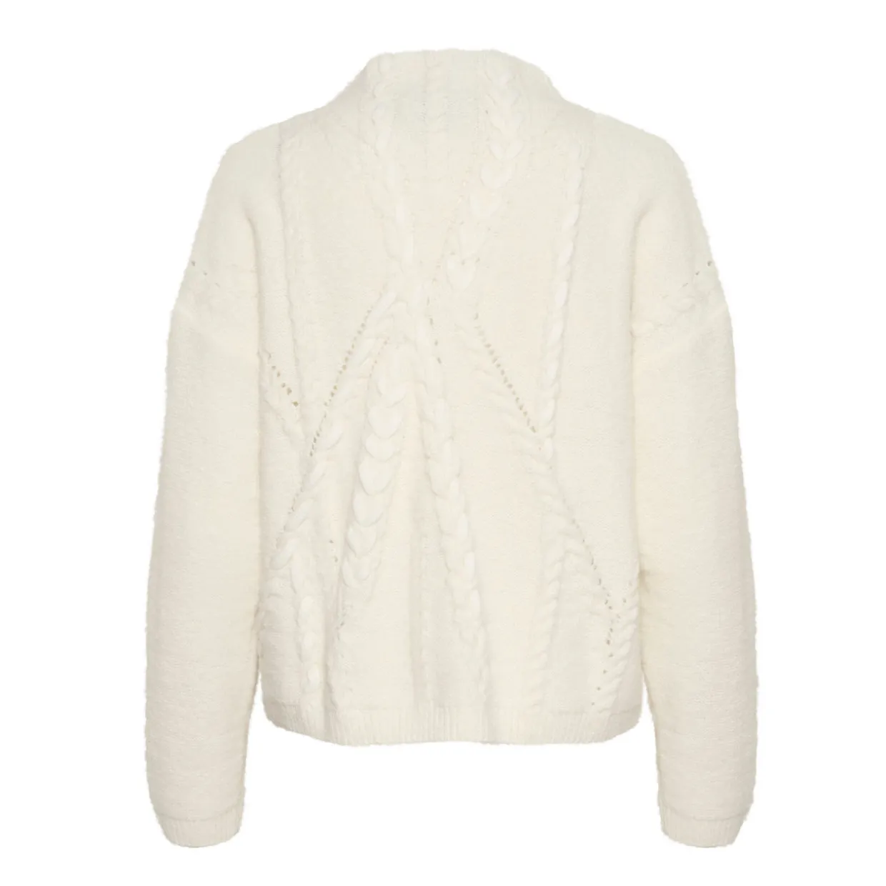 - Mock neckline, long sleeves, dropped shoulders, ribbed trims, patterned design, knitted finish