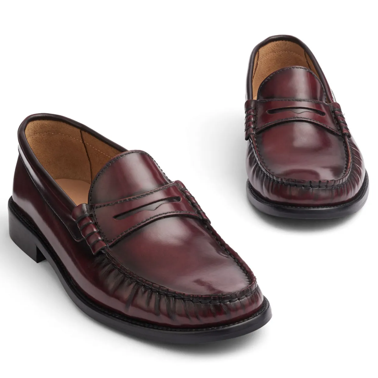 - Almond-shape toe, curved vamp, strap detail, stitched embellishment, burnished finish
