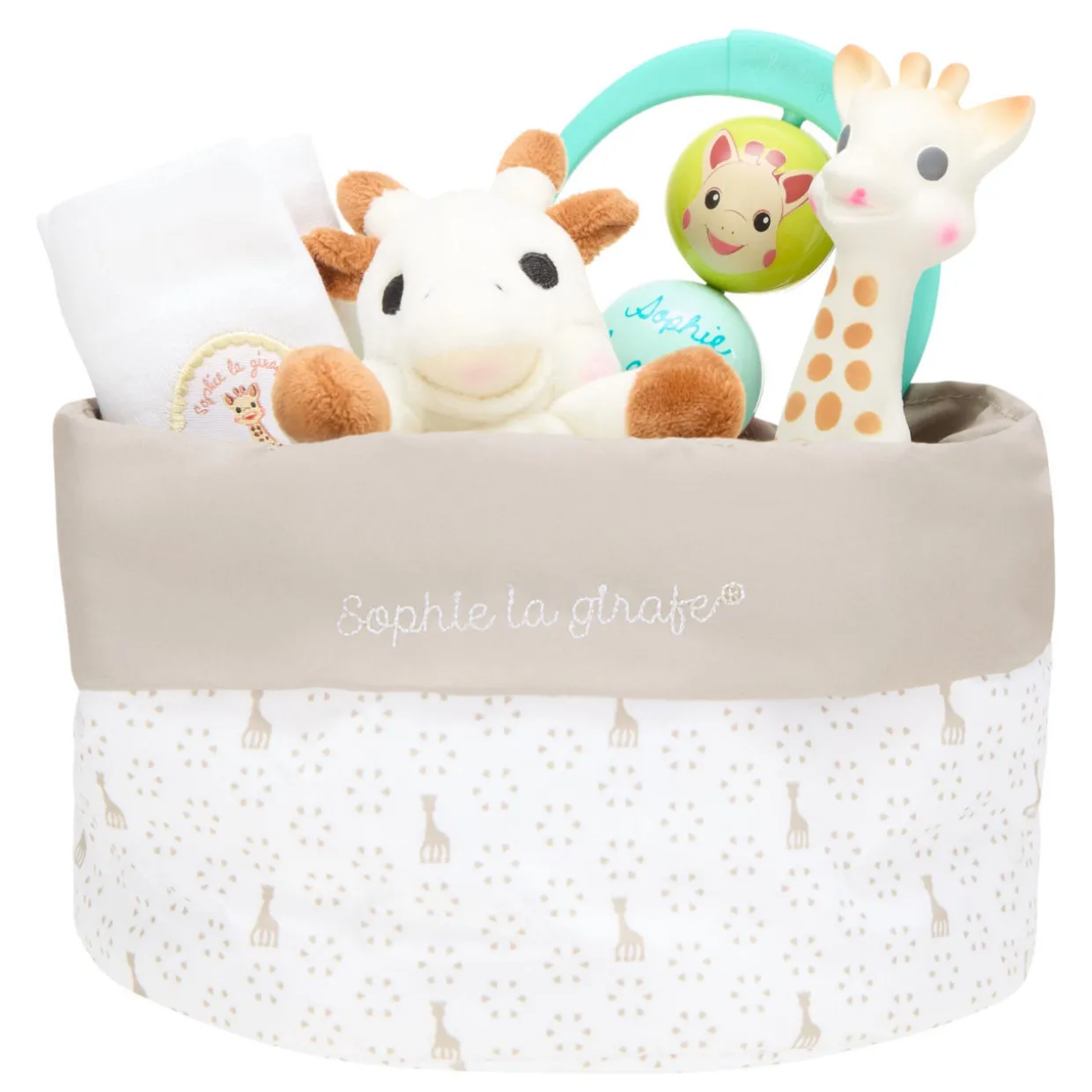 - Set includes: One hamper with two carry handles, one Sophie the Giraffe baby toy and natural rubber teether, one comforter with pacifier holder, one soft muslin, one swing rattle