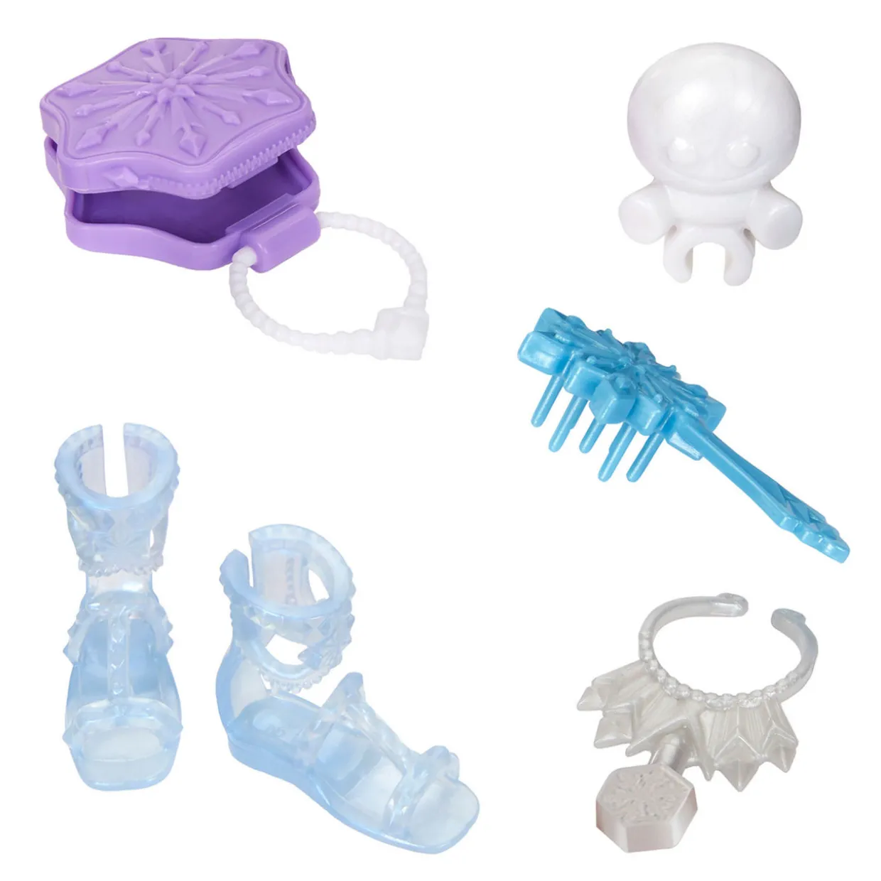 - Spin the package to find 5 mystery bags filled with 5 accessories and 5 stickers, Elsa doll wears a beautiful movie-inspired outfit, decorate the play scene and imagine stories with it as a backdrop. Contents: 1x Doll, 5x Accessories, 5x Stickers, 1x Play Scene