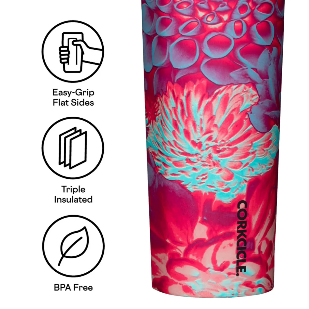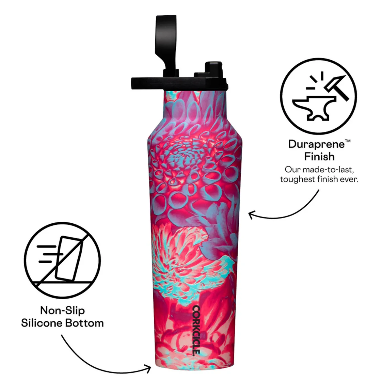 - Triple insulated, wide mouth for ice cubes, folding handle, quick sip cap, strong duraprene™ finish